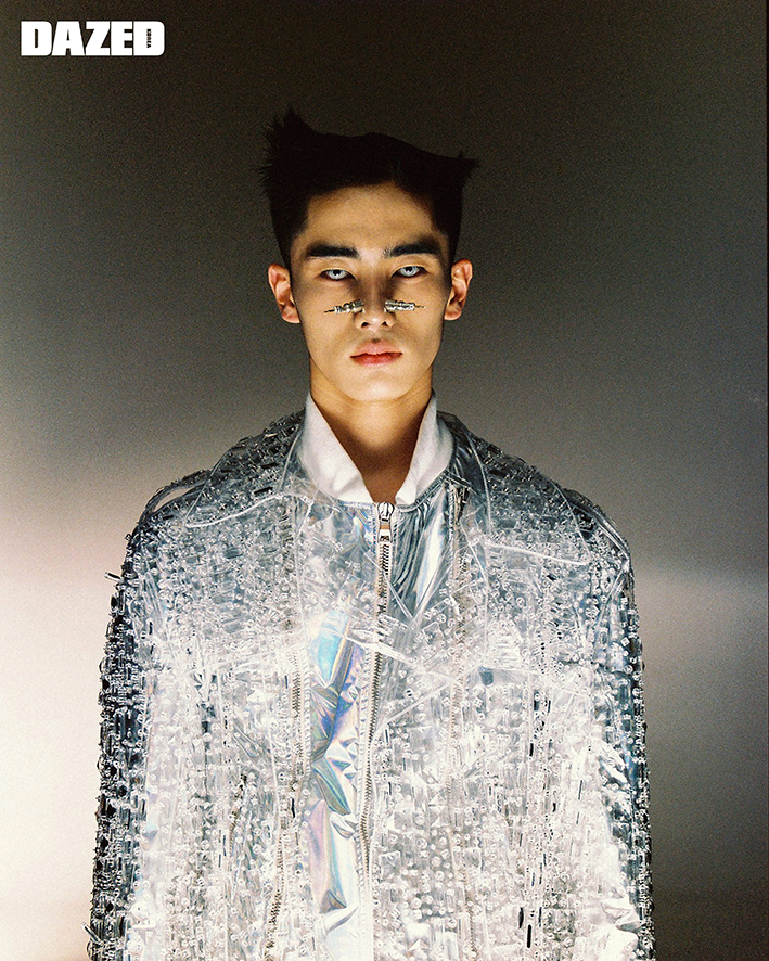 지파쿠가 착용한 화이트 재킷은 강혁(Kanghyuk), 넝쿨처럼 길게 뻗은 헤드피스는 윈도우센(Windowsen).
