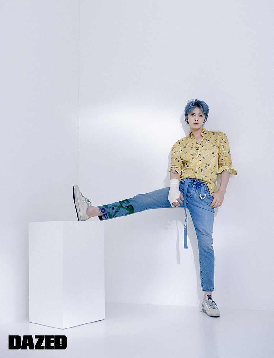 셔츠는 에트로(Etro), 데님 팬츠는 오프화이트(Off-White™), 스니커즈는 골든구스(Golden Goose).