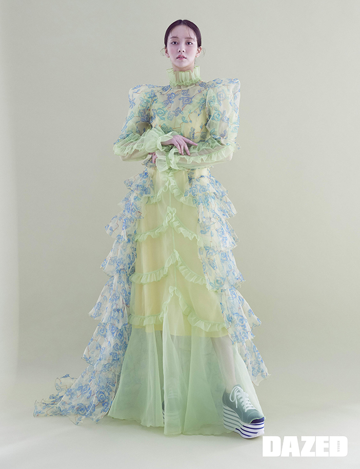 이너로 입은 원피스와 원피스는 듀이듀이(Dew E Dew E), 슈즈는 미우미우(Miu Miu).