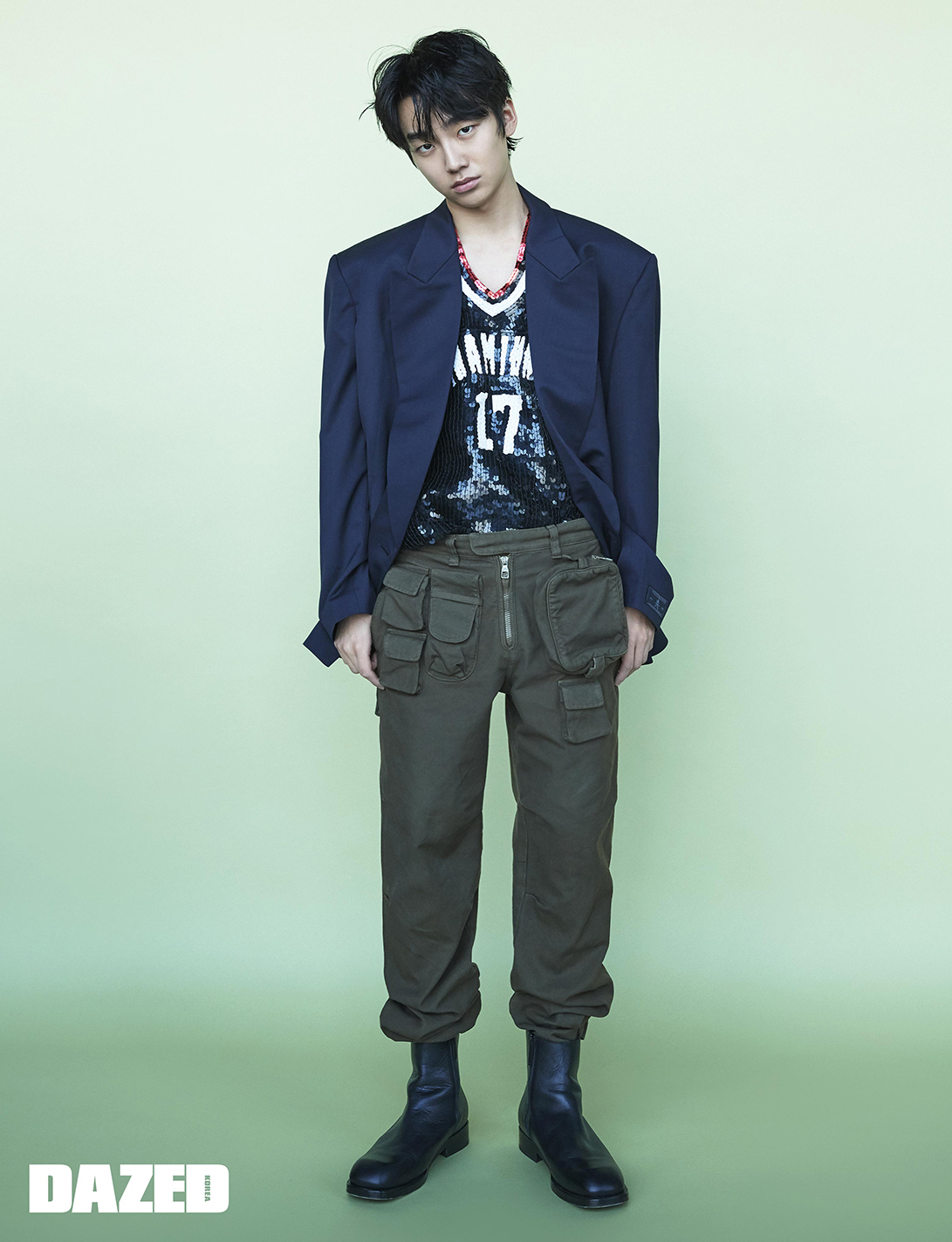 재킷은 베트멍 by 무이(Vetements by Mue), 팬츠는 루이 비통(Louis Vuitton), 부츠는 COS, 톱은 스타일리스트의 것.