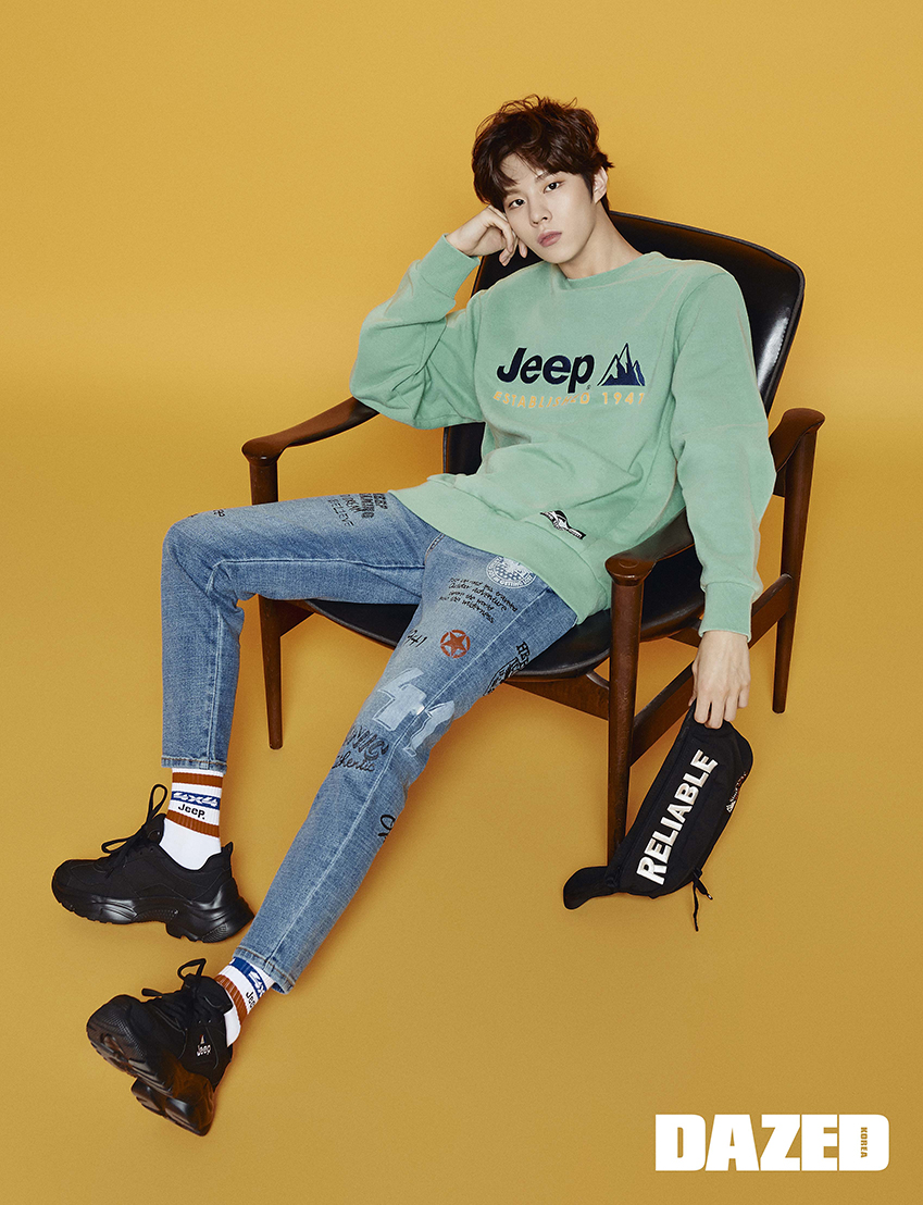 스웨트셔츠와 데님 팬츠, 버킷 해트, 웨이스트 백, 양말, 스니커즈는 모두 지프(Jeep).