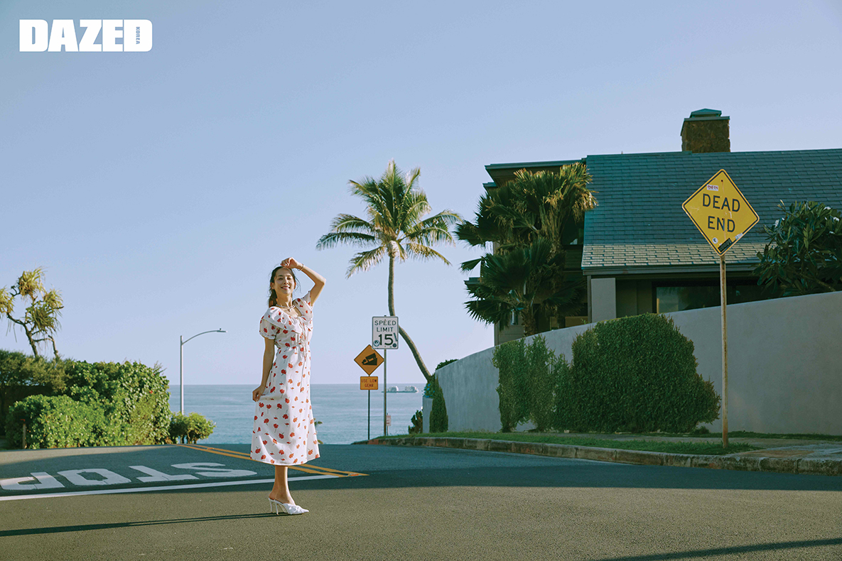 플라워 패턴 드레스는 순수(Soonsu), 뮬은 슈츠(Schutz), 이어링과 네크리스, 브레이슬릿, 링은 모두 다미아니(Damiani).