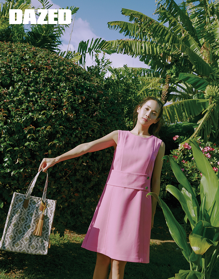 꼬임 디테일 핸들이 특징인 바쓰 백은 닥스(Daks), 드레스는 미스지 컬렉션(Miss Gee Collection).