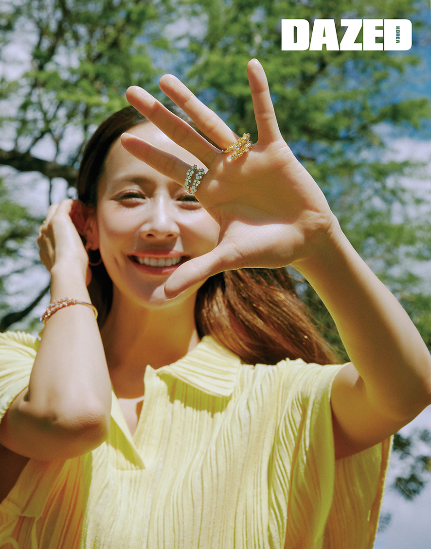 화이트와 핑크, 옐로 골드에 각각 화이트와 브라운 다이아몬드, 애머시스트, 시트린 쿼츠 다이아몬드를 세팅한 이어링과 네크리스, 브레이슬릿, 링은 모두 마르게리타 컬렉션으로 모두 다미아니(Damiani), 드레스는 미스지 컬렉션(Miss Gee Collection).