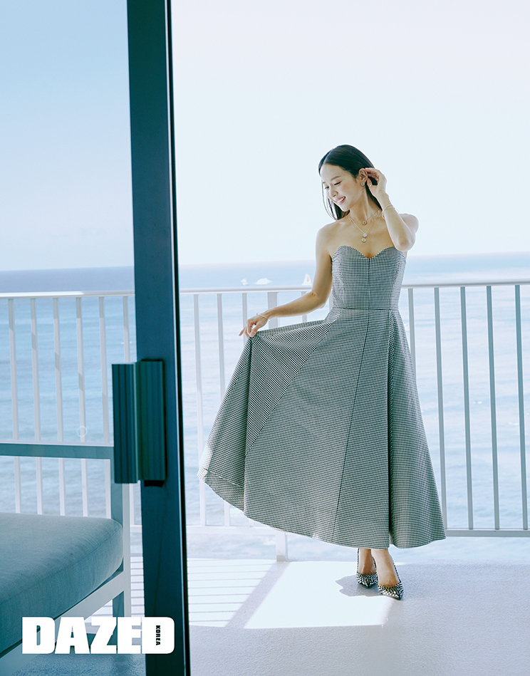 드레스는 미스지 컬렉션(Miss Gee Collection), 펌프스 힐은 아쿠아주라 by 한스타일닷컴(Aquazzura by Hanstyle.com), 이어링과 네크리스, 링, 브레이슬릿은 모두 다미아니(Damiani).
