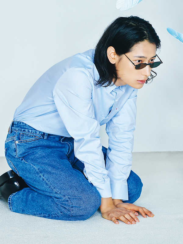 실크 자카르 소재의 멀티컬러 셔츠 톱과 데님은 디올 맨(Dior Men), 어깨에 걸친 니트 톱은 디젤(Diesel), 링은 스타일리스트의 것.