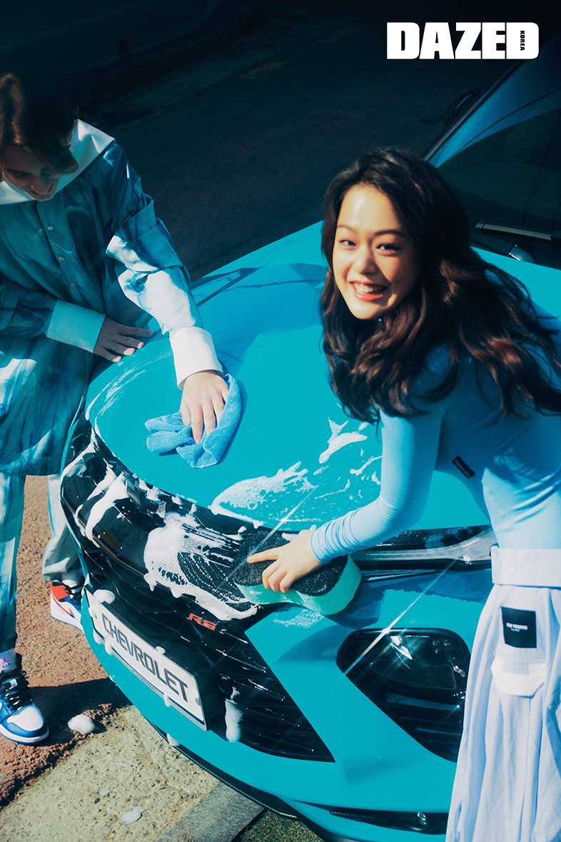 다닐이 착용한 셔츠와 팬츠는 더그레이티스트(The Greatest), 하이톱 스니커즈는 나이키(Nike). 성민이 입은 터틀넥 톱과 스커트는 환영(Fan Young).