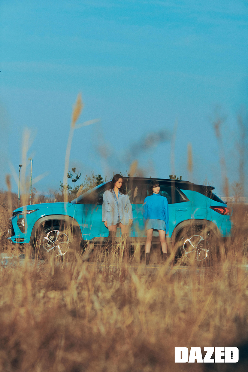 성민이 착용한 데님 재킷과 쇼츠는 이자벨 마랑 에뚜왈(Isabel Marant Étoile), 부츠는 이자벨 마랑(Isabel Marant). 규리가 착용한 터틀넥 톱은 COS, 레이어드한 니트웨어는 환영(Fan Young), 부츠는 레이첼 콕스(Rachel Cox).
