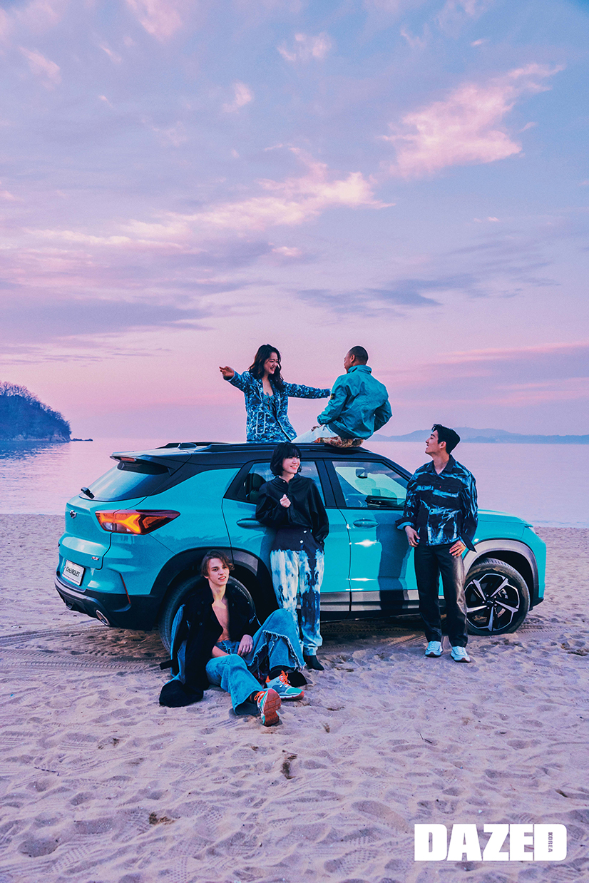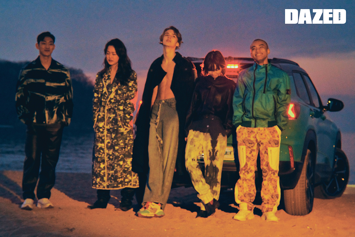 다닐이 착용한 데님 롱 코트는 디젤(Diesel), 팬츠는 유저(Youser), 스니커즈는 크리스찬 루부탱(Christian Louboutin). 규리가 착용한 레더 재킷은 이자벨 마랑(Isabel Marant), 타이다이 데님 팬츠는 제인송(Jain Song), 부츠는 렉켄(Rekken). 용연이 착용한 블루 컬러 재킷은 스톤 아일랜드(Stone Island), 페이즐리 패턴 팬츠는 영케이(YoungK), 스니커즈는 리복(Reebok). 성민이 착용한 롱 코트는 더그레이티스(Thegreatest), 이너로 입은 스윔웨어는 앤아더스토리즈(& Other Stories), 롱부츠는 이자벨 마랑(Isabel Marant). 준평이 착용한 마블 패턴 데님 재킷은 리바이스(Levi’s), 팬츠는 COS, 스니커즈는 컨버스(Converse).