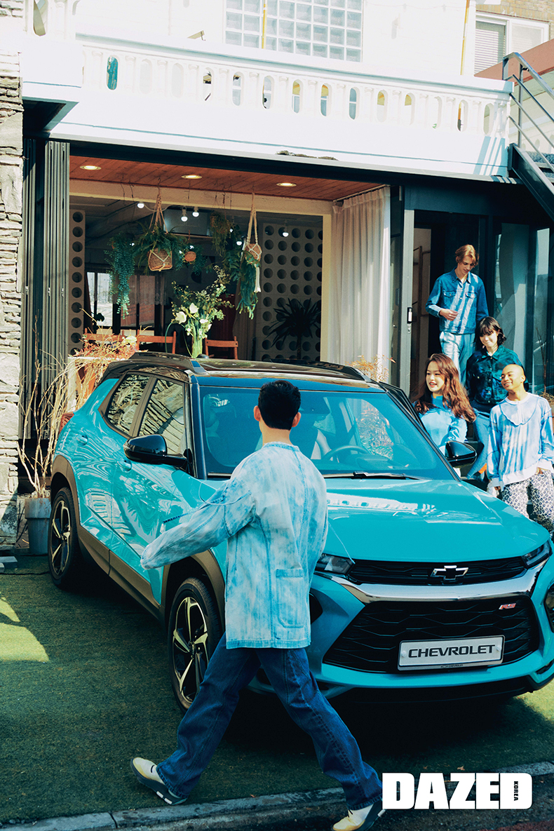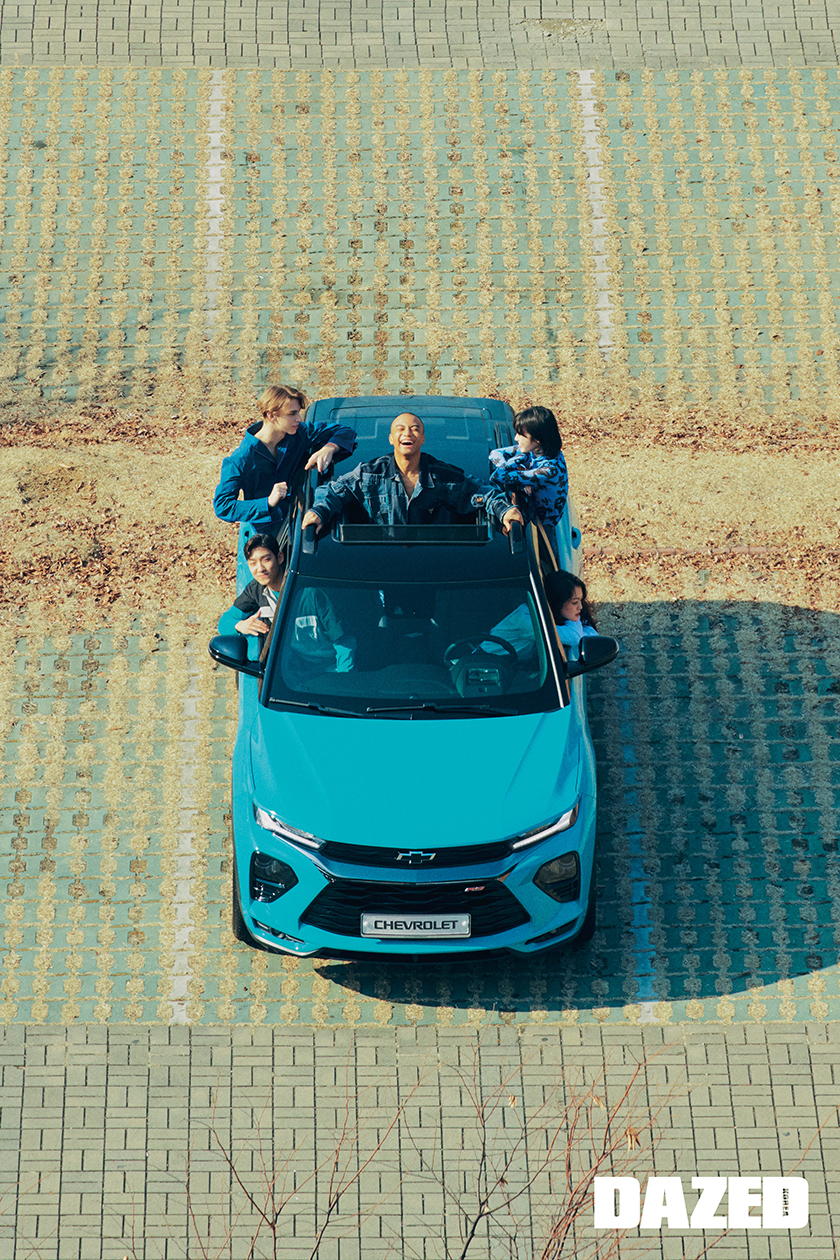 준평이 착용한 데님 재킷은 와이즈(Y’s), 팬츠는 태우(Taewoo), 스니커즈는 준평의 것. 성민이 입은 터틀넥 톱은 환영(Fan Young). 용연이 입은 맨투맨과 팬츠는 영케이(YoungK). 규리가 입은 데님 재킷은 엠에스지엠 by 한스타일닷컴(MSGM by Hanstyle.com), 스커트는 유저(Youser). 다닐이 입은 데님 재킷은 리바이스(Levi’s), 팬츠는 블라인드니스(Blindness).