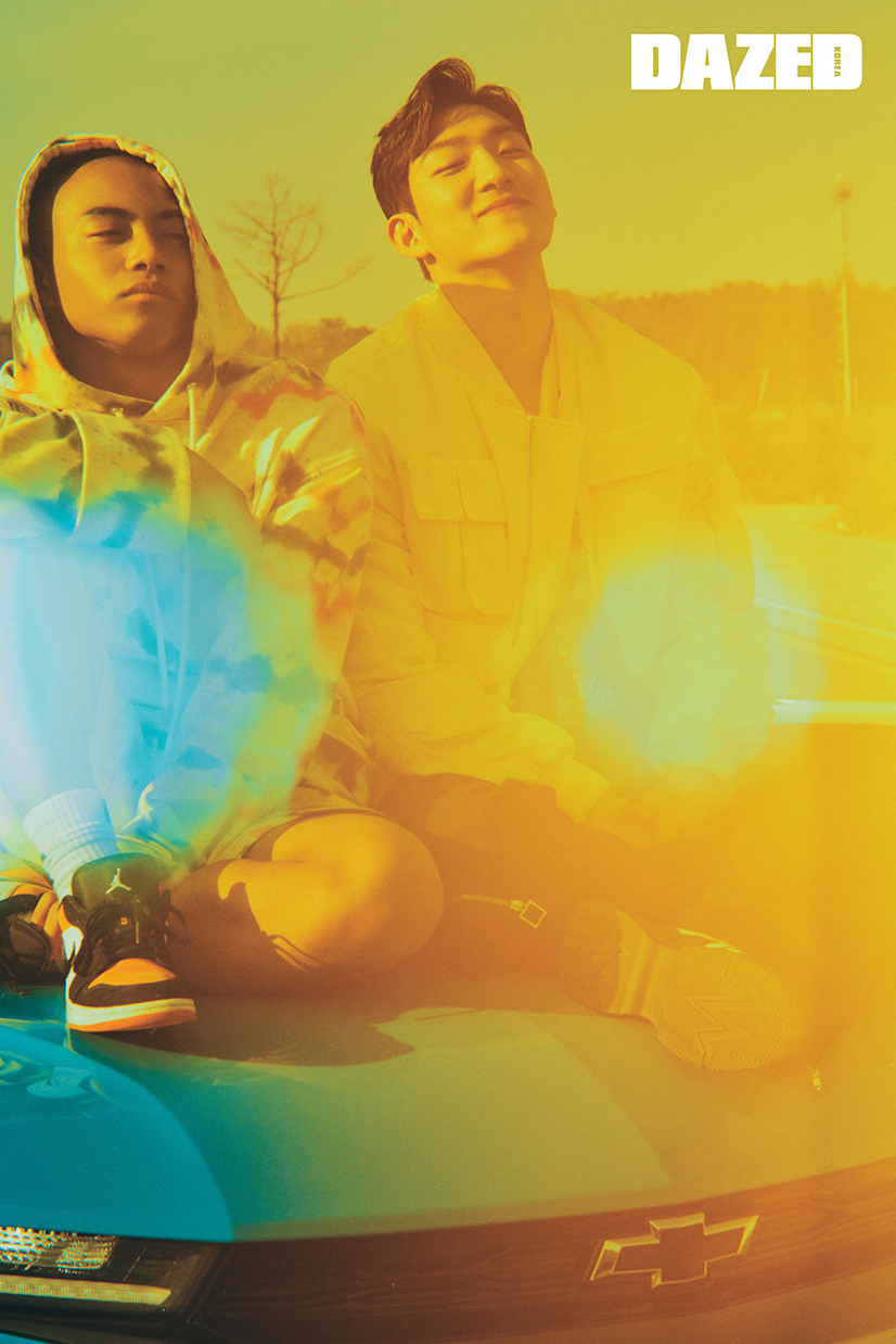 용연이 착용한 타이다이 패턴 후디와 쇼츠는 우영미(Wooyoungmi), 스니커즈는 나이키(Nike), 양말은 용연의 것. 준평이 착용한 보머 재킷과 하와이안 셔츠, 블랙 팬츠는 모두 우영미(Wooyoungmi), 스니커즈는 렉켄(Rekken).