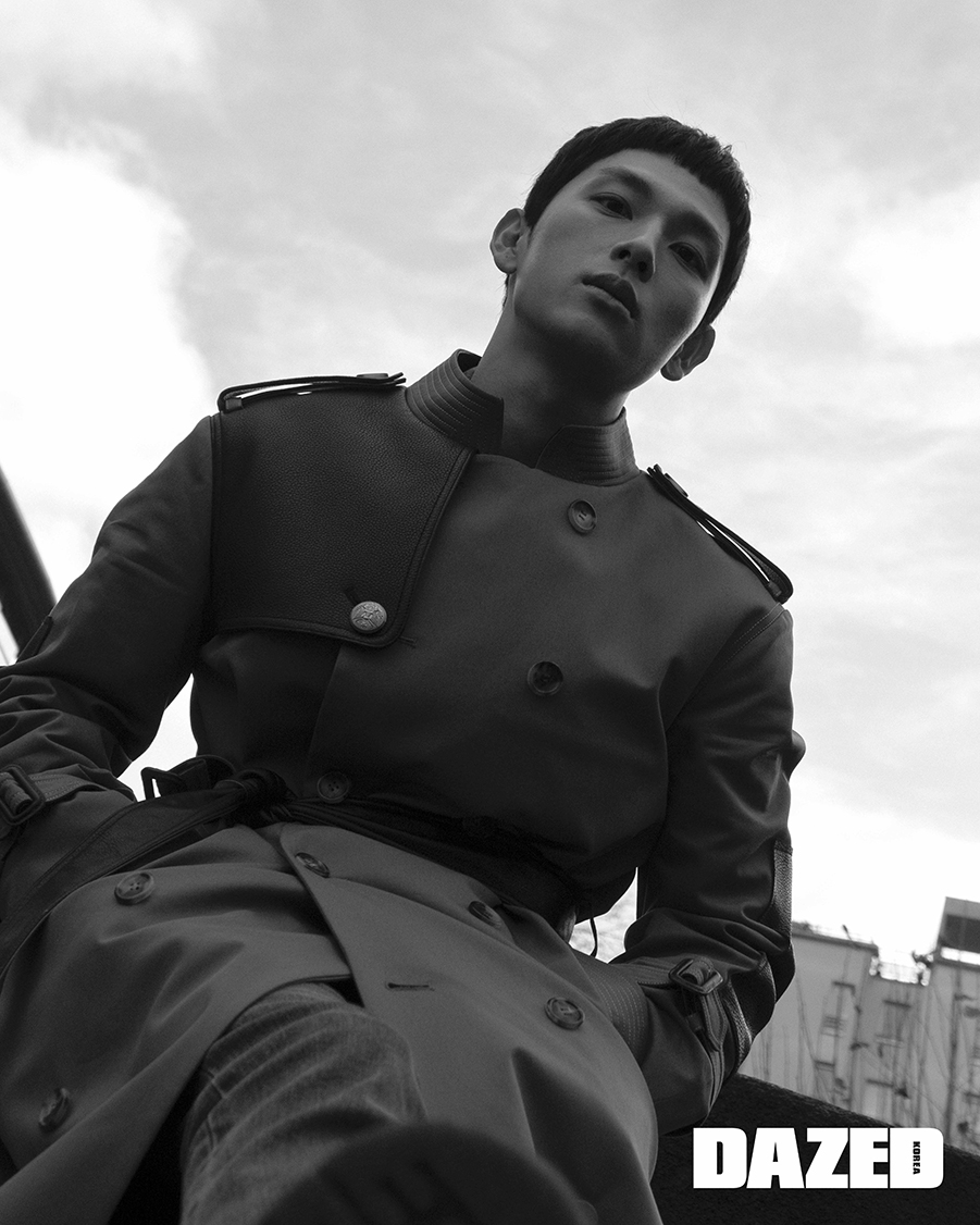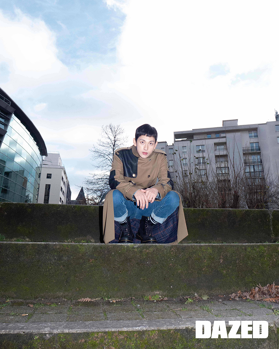 레더 패치 디테일의 트렌치코트는 네이비 by 비욘드클로젯(Navy by Beyond Closet), 데님 팬츠는 플랙(Plac), 워커 부츠는 닥터마틴(Dr. Martens).