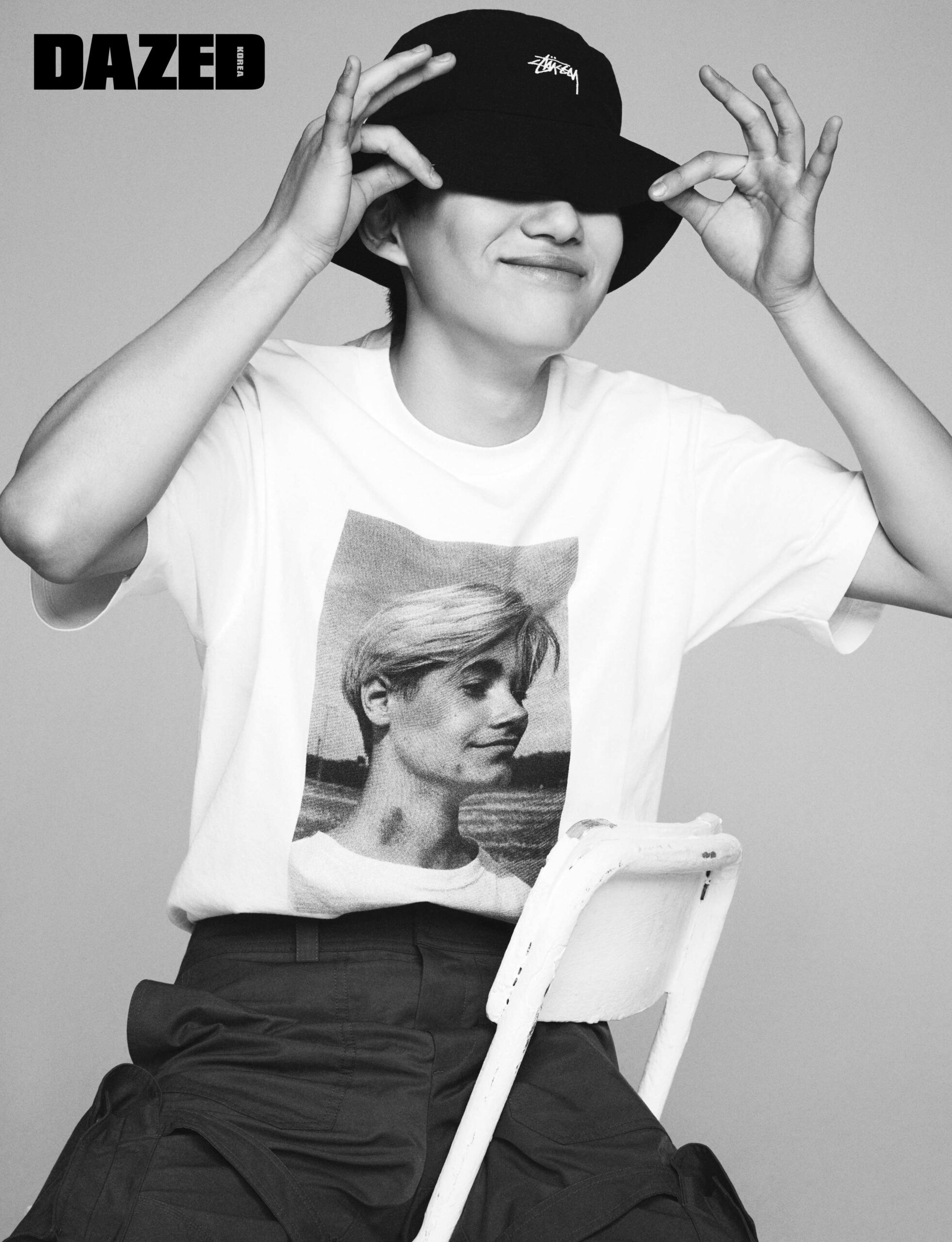 팬츠는 루이 비통(Louis Vuitton), 모자는 스투시(Stussy), 티셔츠는 스타일리스트의 것.