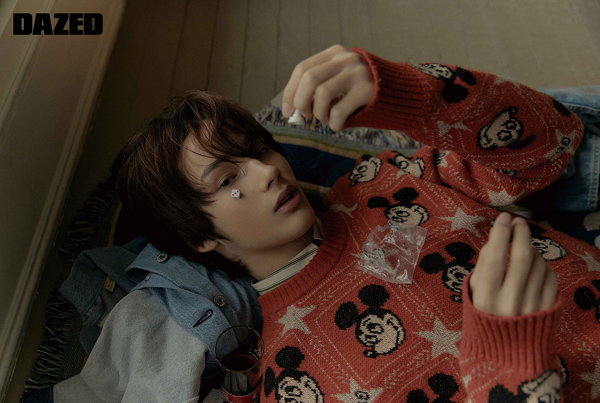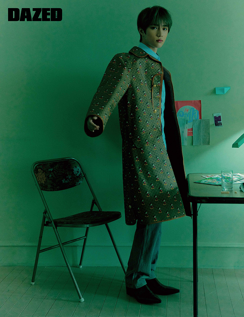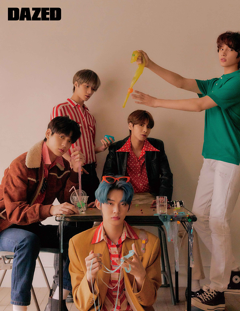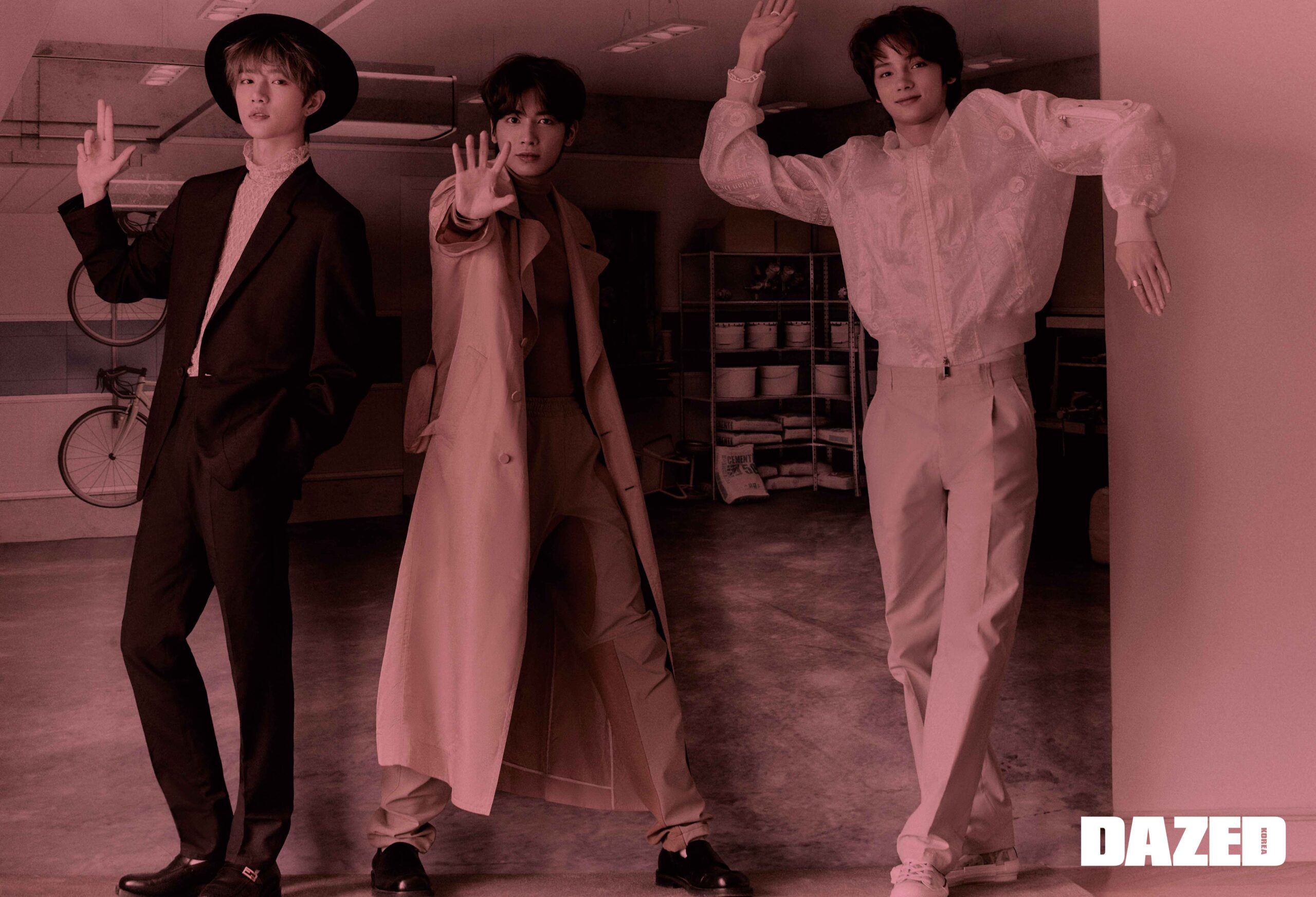 범규가 입은 슈트는 에르메네질도 제냐 XXX(Ermenegildo Zegna XXX), 톱은 오디너리 피플(Ordinary People), 슈즈는 펜디(Fendi), 모자는 구찌(Gucci). 태현이 입은 코트는 김서룡 옴므(Kimseoryong Homme), 톱과 팬츠, 슈즈는 모두 보테가 베네타(Bottega Veneta). 휴닝카이가 입은 재킷과 팬츠, 슈즈는 모두 디올 맨(Dior Men).