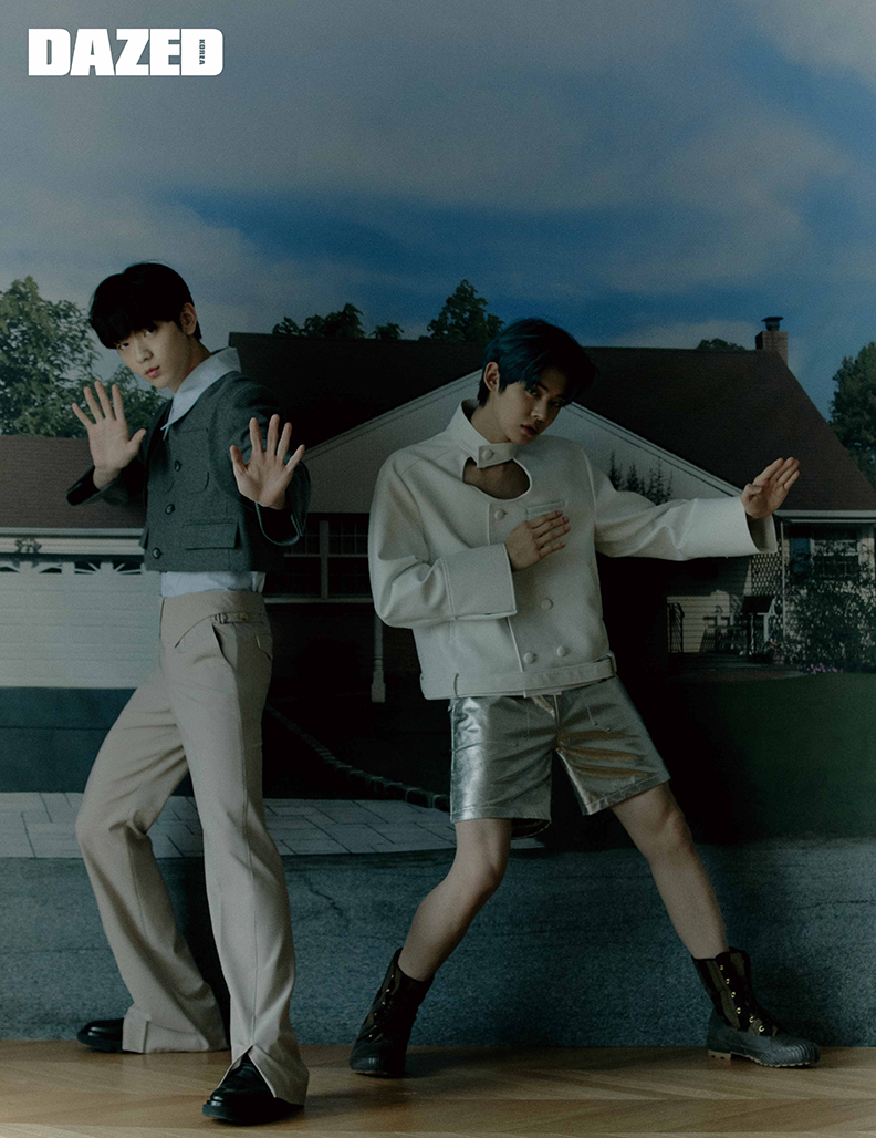 수빈이 입은 재킷은 엔초비(Anchovi), 셔츠는 노앙(Nohant), 팬츠는 오디너리 피플(Ordinary People), 슈즈는 지방시(Givenchy). 연준이 입은 재킷은 기준(Kijun), 팬츠는 오디너리 피플(Ordinary People), 부츠는 펜디(Fendi).
