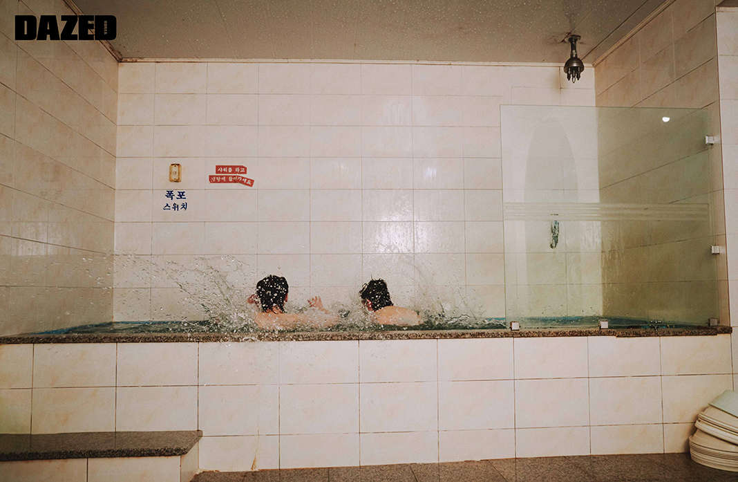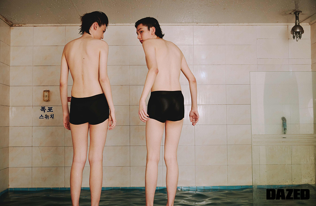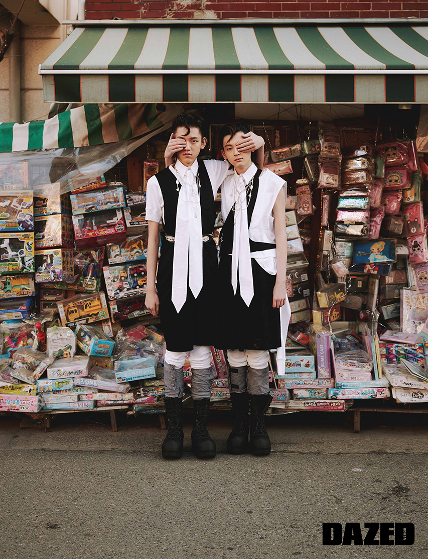 지용이 착용한 화이트 점프슈트, 블랙 점프슈트, 신가드, 네크리스, 머플러, 벨트, 부츠는 모두 타카히로 미야시타 더 솔로이스트(TakahiroMiyashita The Soloist). 지훈이 착용한 화이트 점프슈트와 슬리브리스 셔츠, 버뮤다 팬츠, 신가드, 네크리스, 머플러, 부츠는 모두 타카히로 미야시타 더 솔로이스트(TakahiroMiyashita The Soloist).