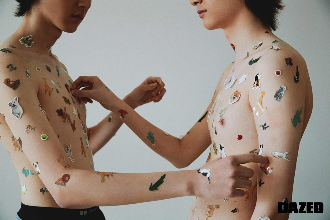 지용이 착용한 청바지와 플라워 키링은 르제(Leje), 화이트 스니커즈는 루이 비통(Louis Vuitton). 지훈이 착용한 화이트 팬츠는 카르넷 아카이브(Carnet Archive), 슈즈는 살바토레 페라가모(Salvatore Ferragamo).