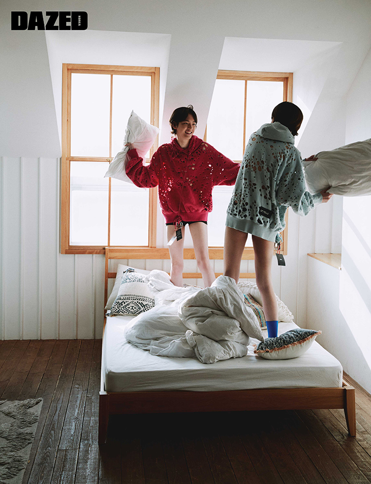 지용이 착용한 펀칭 디테일 핑크색 후디는 웰던(We11done), 양말은 디올 맨(Dior Men). 지훈이 착용한 펀칭 디테일 하늘색 후디는 웰던(We11done), 포켓 백은 로에베(Loewe).