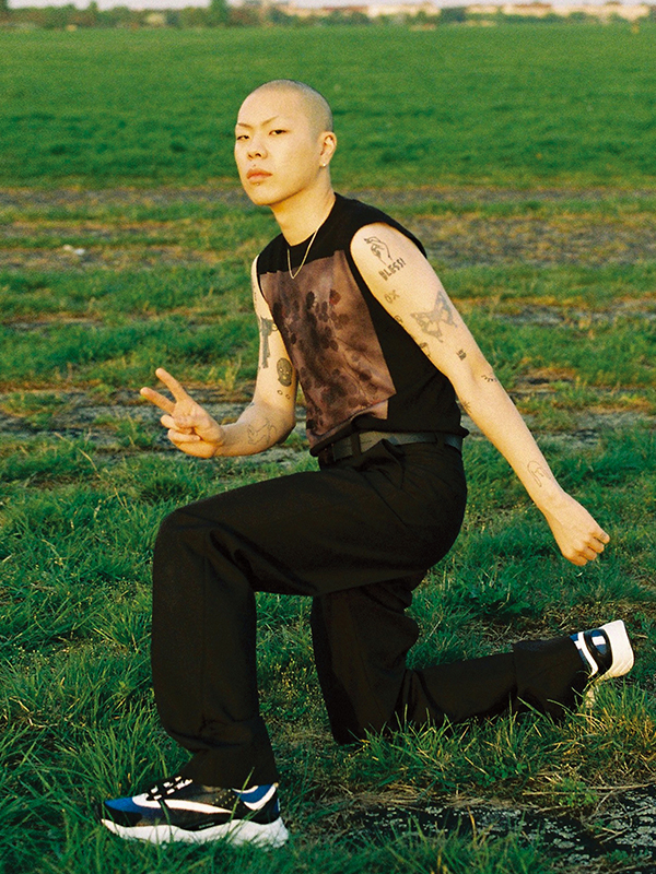 동현이 입은 프린트 티셔츠는 오프화이트(Off-White™), 언더웨어는 캘빈클라인 언더웨어(Calvin Klein Underwear), 모자와 레이스업 부츠는 프라다(Prada), 모든 링은 레이빌즈(Reybuilds). 토멕이 입은 화이트 티셔츠는 발렌티노(Valentino), 언더웨어는 캘빈클라인 언더웨어(Calvin Klein Underwear), 하이톱 스니커즈는 알렉산더 맥퀸(Alexander McQueen), 링은 루이 비통(Louis Vuitton).