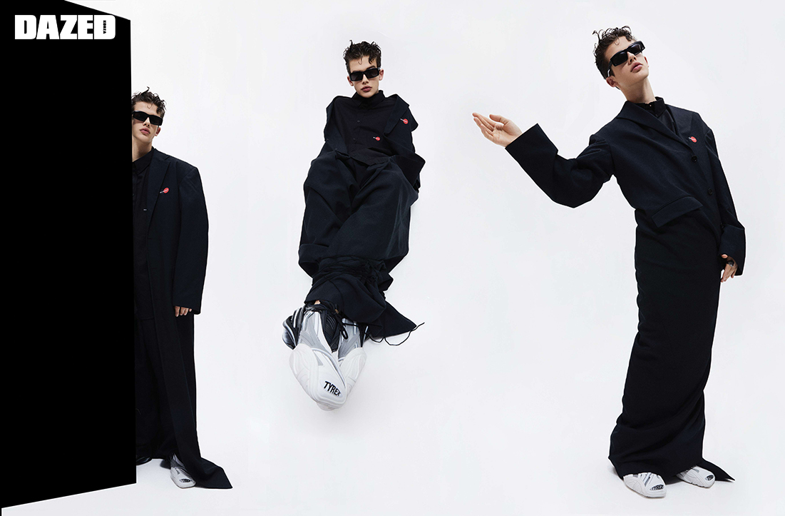 로고 포인트 롱 코트와 셔츠, 팬츠, 선글라스, 링, 타이렉스 스니커즈는 모두 발렌시아가(Balenciaga).