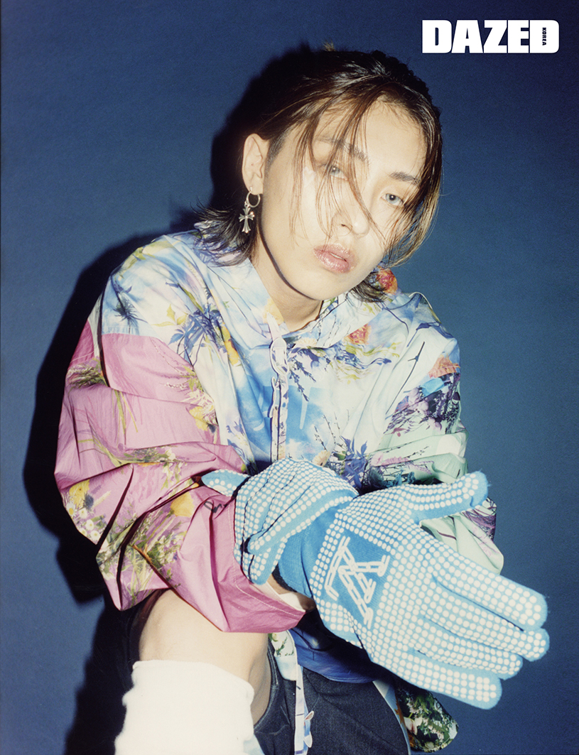 플라워 포플린 패치워크 후디와 로고 글러브는 루이 비통(Louis Vuitton), 팬츠는 엔초비(Anchovi), 이어링은 크롬하츠(Chrome Hearts), 레그 워머는 스타일리스트의 것.