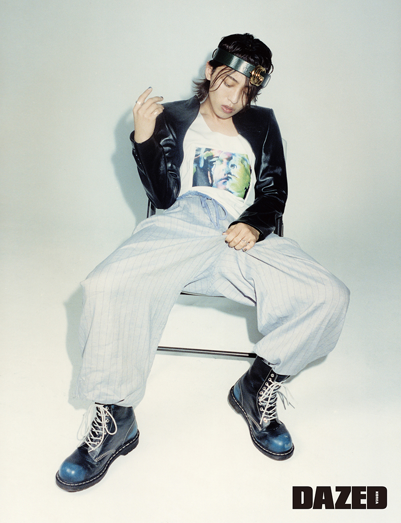 레더 재킷은 문선(Moonsun), 프린트 톱과 스트라이프 팬츠는 챈스챈스(Chance Chance), 워커는 닥터마틴(Dr. Martens), 머리띠로 연출한 벨트는 구찌(Gucci).
