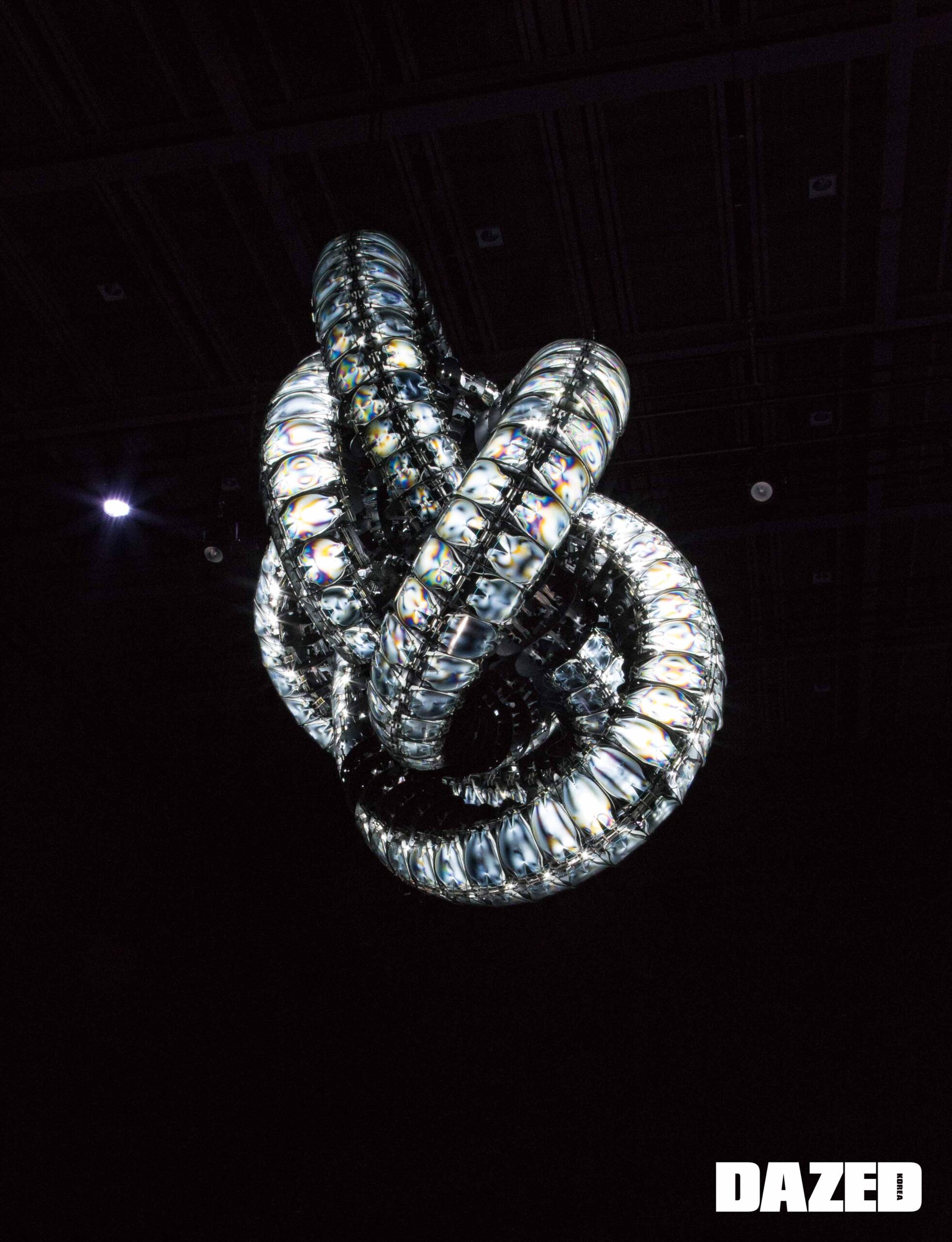 작품명은 ‘크로마Chroma’. 김윤철 작가의 2019년 작품이자 새로운 성질의 물질을 소재로 한 조형물이며, 매듭에서 영감을 받아 완성했다.