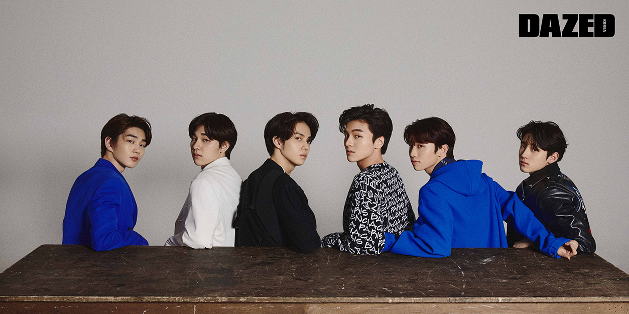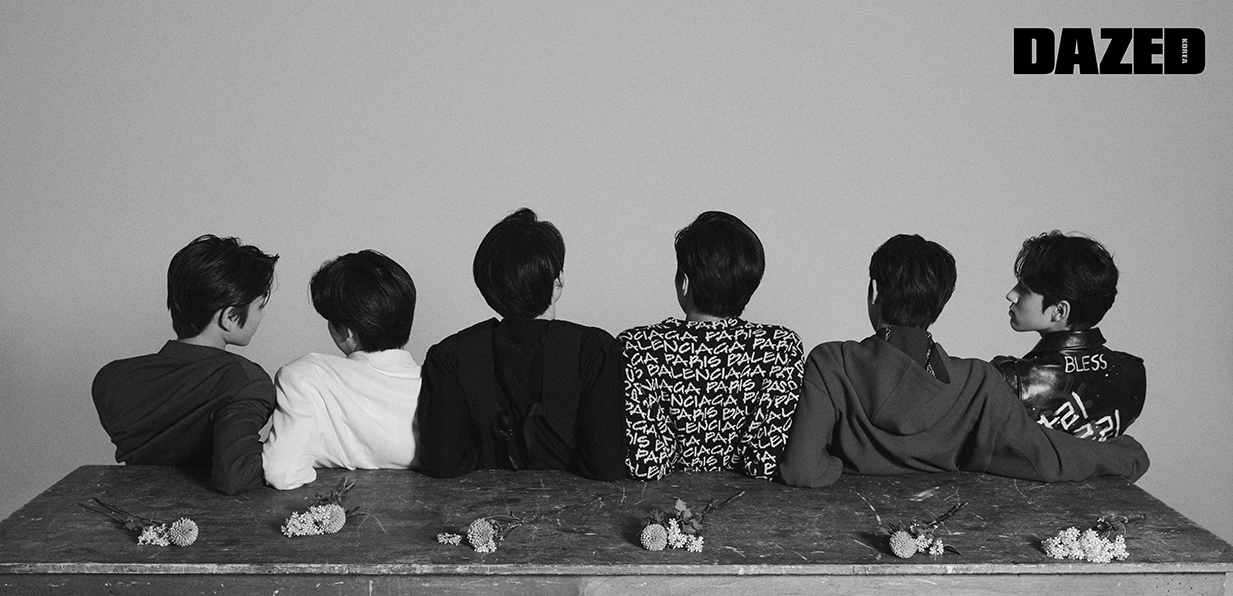 창욱이 입은 블루 재킷과 셔츠는 벨루티(Berluti). 동윤이 입은 화이트 재킷은 오디너리 피플(Ordinary People). 윤성이 입은 블랙 니트 톱은 오디너리 피플(Ordinary People), 베스트는 6 몽클레르 1017 알릭스 9SM(6 Moncler 1017 Alyx 9SM). 준호가 입은 레터링 니트 톱은 에디터의 것. 협이 입은 후드 코트는 벨루티(Berluti). 민서가 입은 레더 재킷은 더 뮤지엄 비지터(The Museum Visitor).
