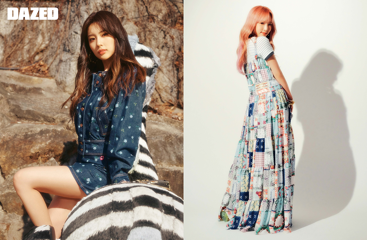 (왼쪽)은비가 입은 시퀸 슬리브리스 드레스는 더애쉴린(The Ashlynn), 안에 입은 셔츠는 푸시 버튼(Push Button), 슈즈는 아식스 스포츠스타일(ASICS SportStyle), 양말은 에디터의 것. (오른쪽)사쿠라가 입은 플라워 패턴 드레스는 8 몽클레르 리차드 퀸(8 Moncler Richard Quinn).