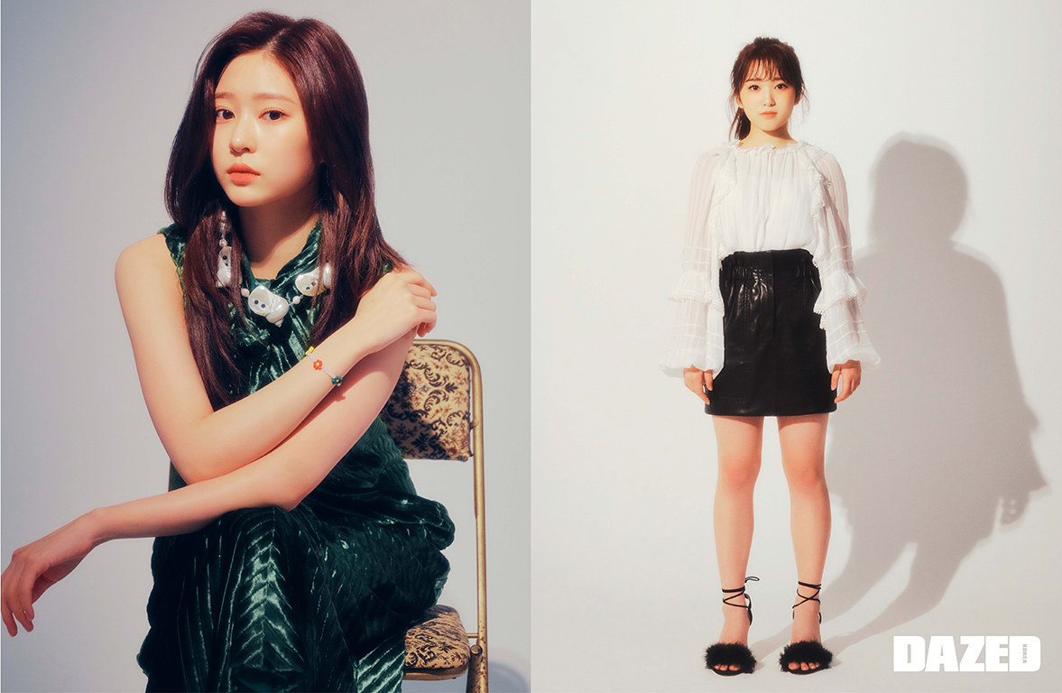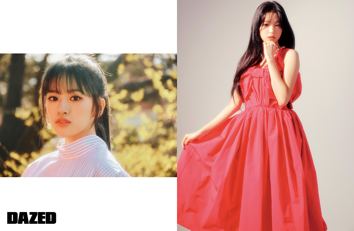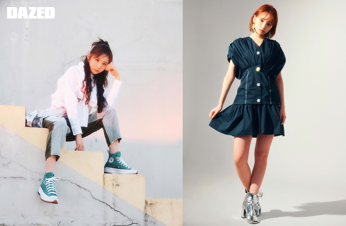(왼쪽)채연이 입은 셔츠 톱과 배색 데님 팬츠는 알렉산더 왕(Alexander Wang), 허리에 묶은 스커트는 COS, 스니커즈는 컨버스(Converse), 이어링은 포트레이트 리포트(Portrait Report). (오른쪽)채원이 입은 드레스는 로맨시크(Romanchic), 이어링은 프라다(Prada), 메탈릭한 슈즈는 에디터의 것.