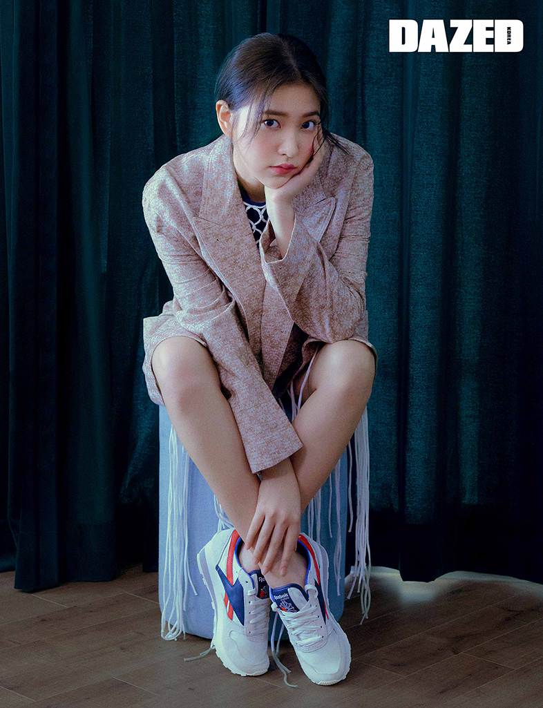 클래식 모델을 재해석해 아이코닉한, 브랜드 키 컬러가 돋보이는 씨엘 레더 아즈텍 스니커즈는 리복(Reebok), 기하학 패턴 재킷은 아크네 스튜디오(Acne Studios), 재킷 안에 입은 그물 모티브의 프린지 드레스는 오프화이트(Off-White™).