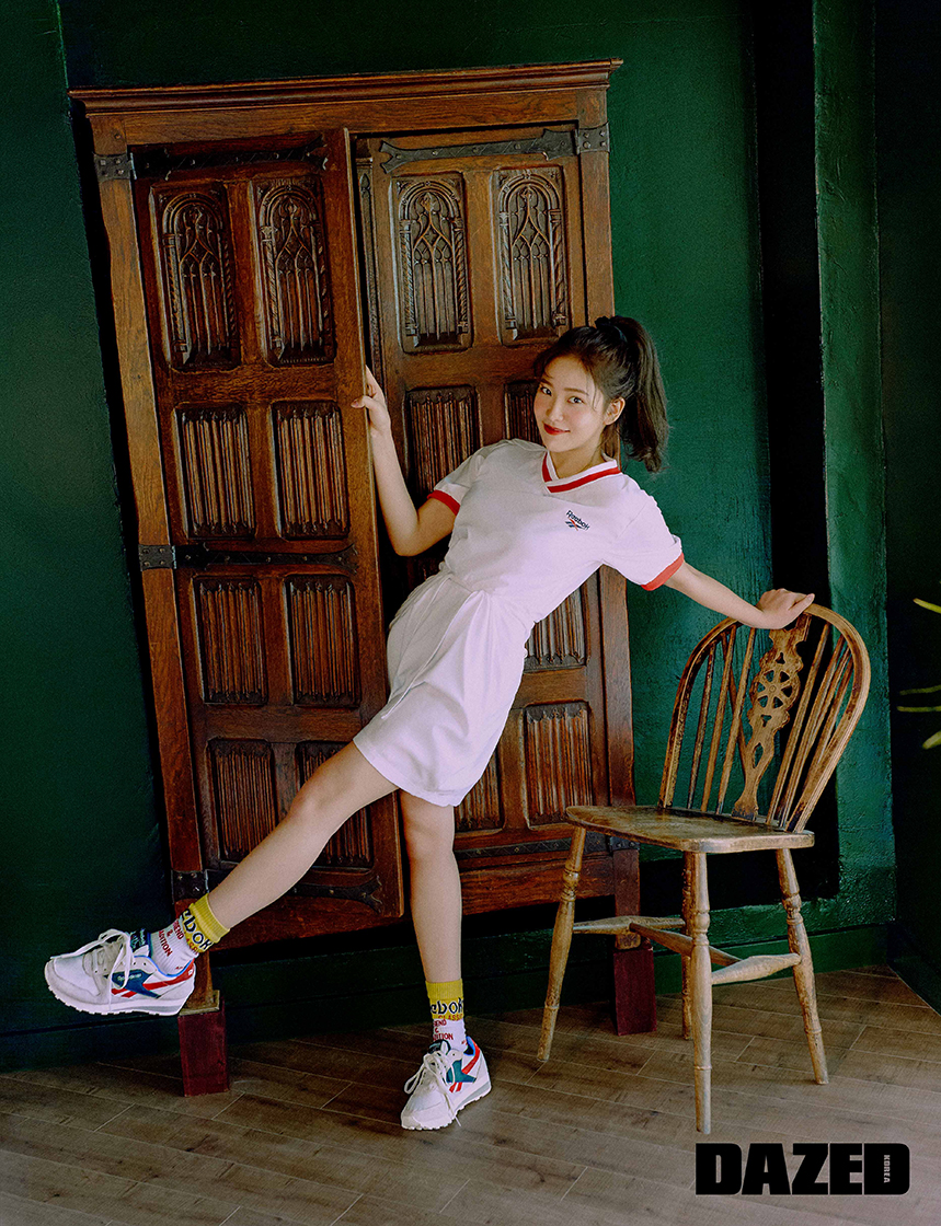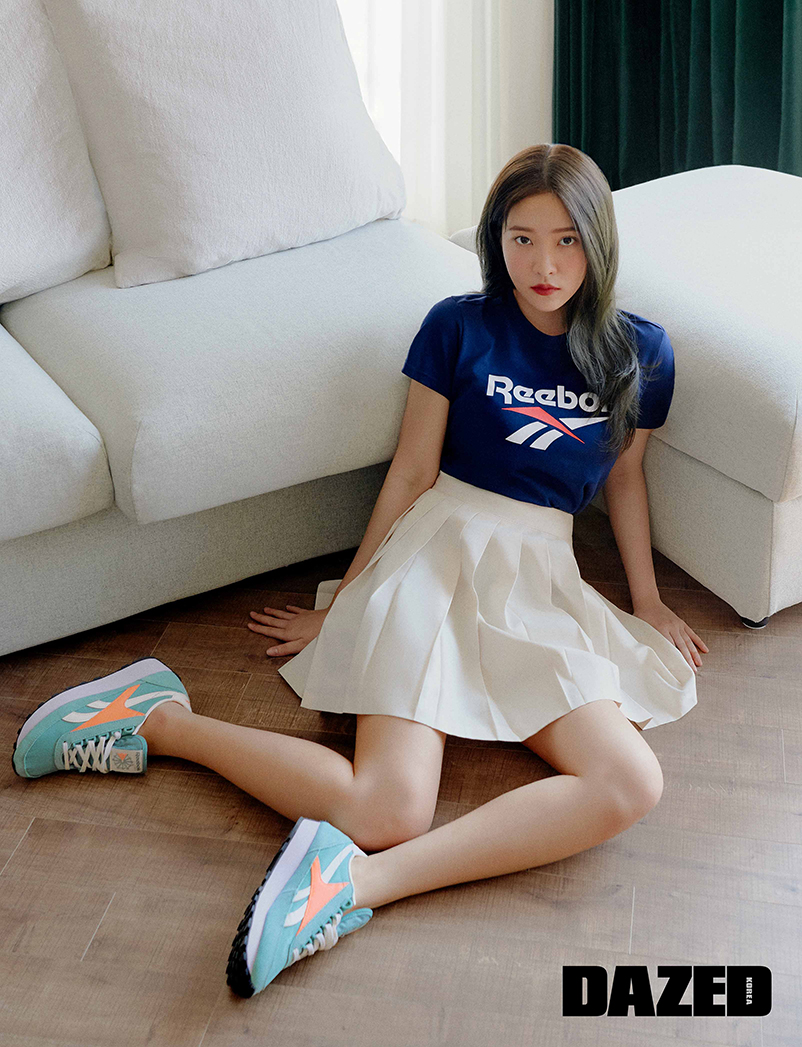 커다란 로고 프린트가 돋보이는 베이식한 크롭트 티셔츠와 클래식 모델을 재해석한 아즈텍 프린세스 스니커즈는 리복(Reebok), 플리츠스커트는 핑크파인애플(Pinkpineapple).