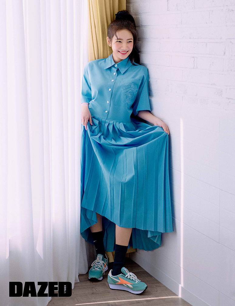 클래식 모델을 재해석한 아즈텍 프린세스 스니커즈와 로고 양말은 리복(Reebok), 셔츠 칼라 디테일 원피스는 민주킴(Minjukim).