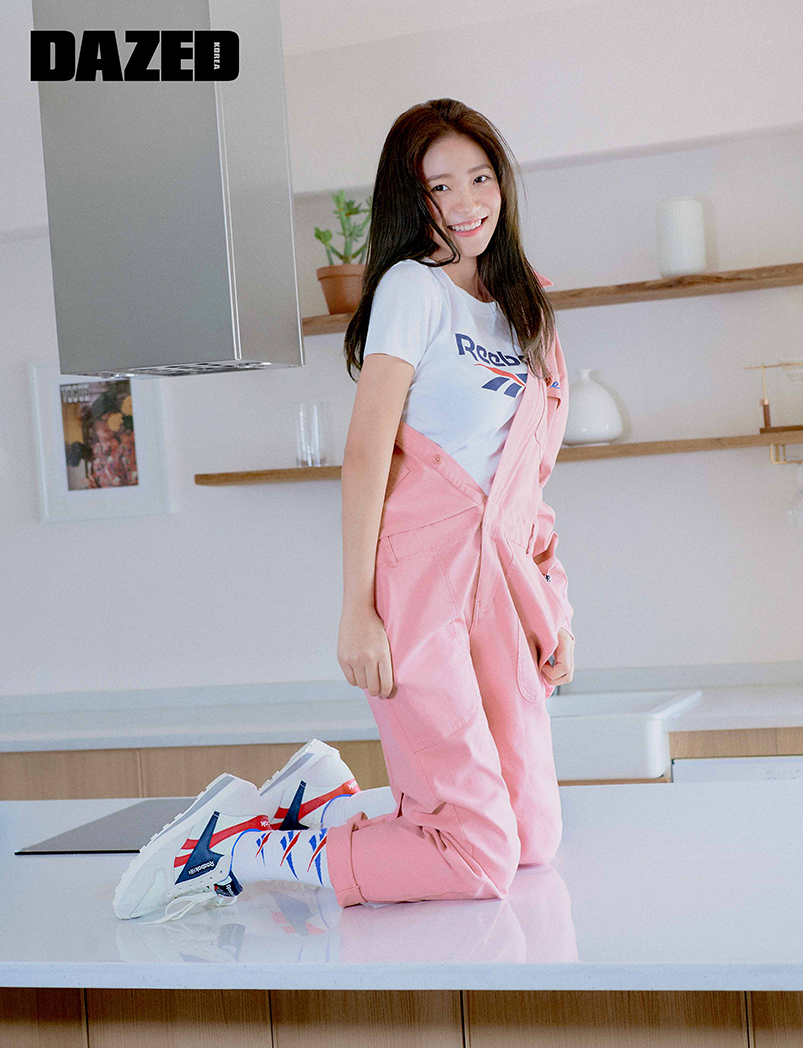 커다란 로고 프린트로 포인트를 준 크롭트 티셔츠와 클래식 모델을 재해석해 아이코닉한, 브랜드 키 컬러가 돋보이는 씨엘 레더 아즈텍 스니커즈는 리복(Reebok), 핑크 컬러 점프슈트는 지프(Jeep).