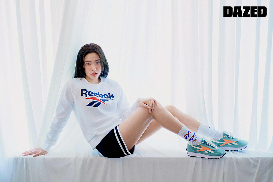 커다란 로고 프린트가 돋보이는 베이식한 스웨트셔츠와 파이핑 디테일의 트랙 쇼츠, 로고 프린트 양말, 클래식 모델을 재해석한 아즈텍 프린세스 스니커즈는 모두 리복(Reebok).