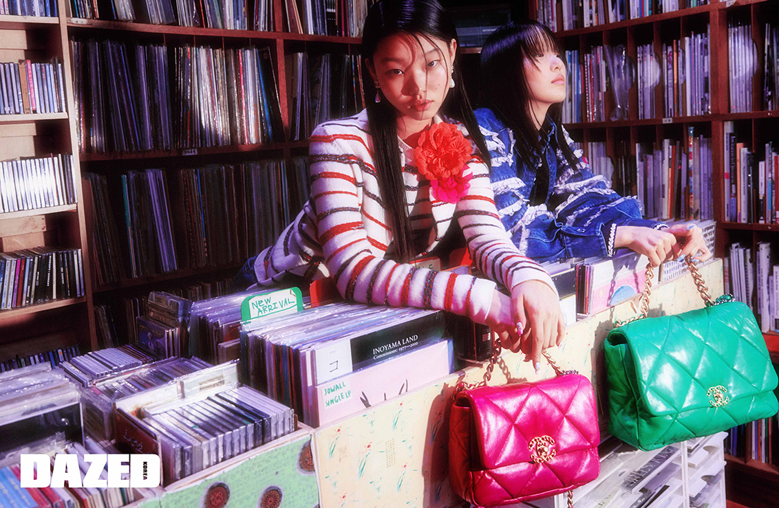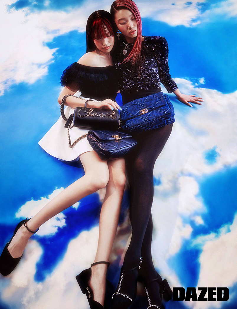 도현이 입은 자수 장식 실크 오간자 드레스와 카프스킨 메리제인, 레터링 카프스킨 볼링 백, 네이비 블루 샤넬19 백은 모두 샤넬(Chanel). 윤영이 입은 자수 장식 실크 모슬린 톱과 쇼츠, 스트라스 장식의 새틴 소재 샌들, 하트 모양 네크리스, 이어링, 워시드 데님 샤넬19 백은 모두 샤넬(Chanel).