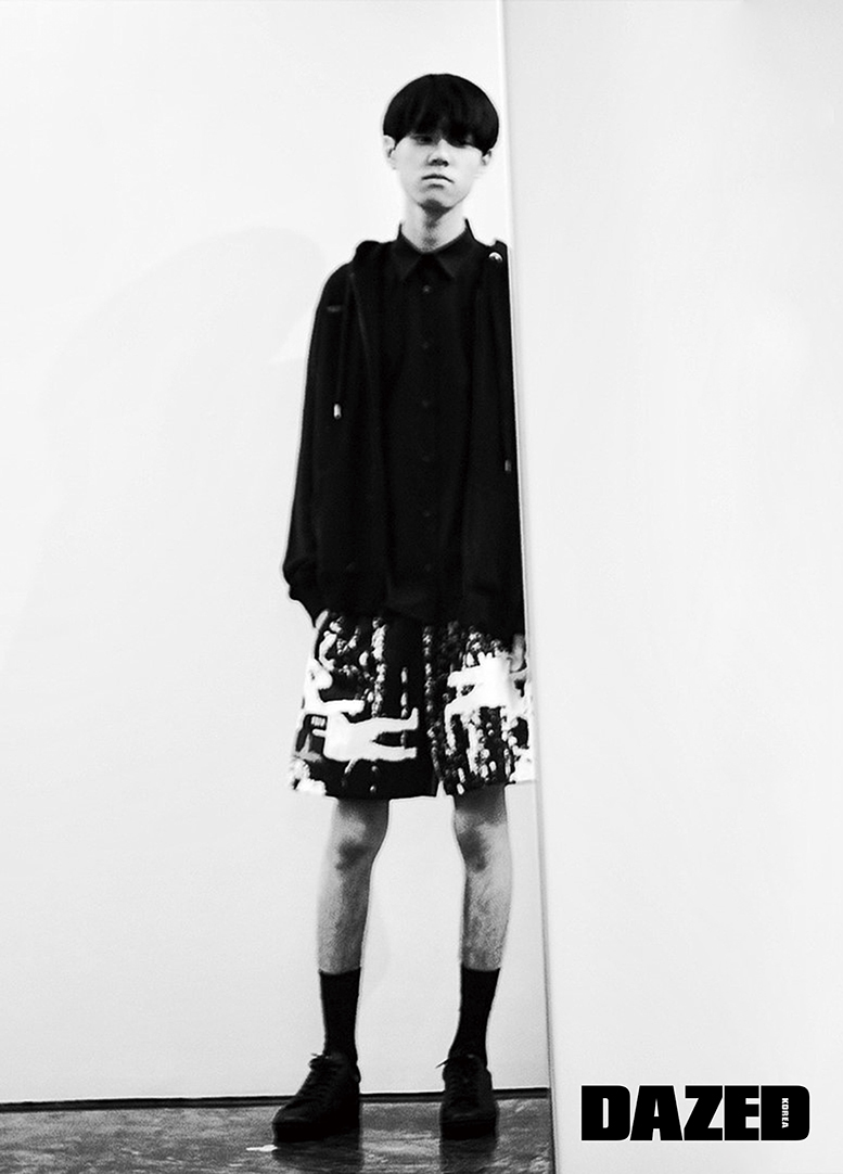 후드 파카와 레귤러 칼라 셔츠, 프린트 쇼트팬츠는 모두 thXVier Antwerp.