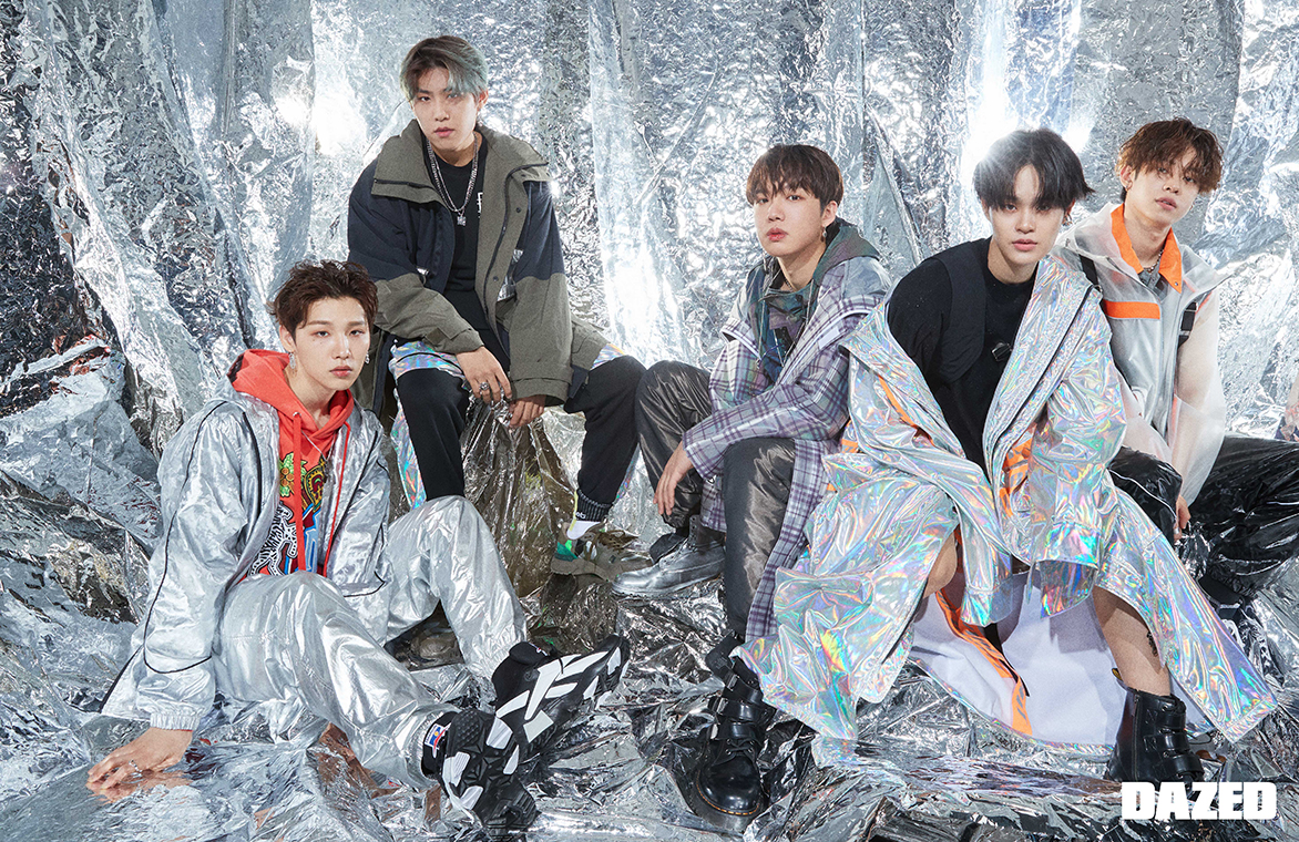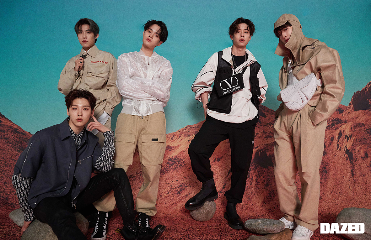 웅이 입은 블루종과 패턴 셔츠는 디올 맨(Dior Men), 블랙 버클 워커는 닥터마틴(Dr. Martens), 블랙 진은 스타일리스트의 것. 우진이 입은 베이지 레니아 로사 재킷과 이너로 입은 화이트 롱 셔츠, 베이지 쇼츠, 넥 스트랩은 모두 프라다(Prada). 대휘가 입은 화이트 로고 재킷은 디올 맨(Dior Men), 베이지 컬러 오버사이즈 팬츠는 네스티킥(NSTK), 하이톱 스니커즈는 프라다(Prada). 동현이 입은 블랙 베스트는 마크엠(Mark M), 아이보리 레더 후드 집업은 막시제이(MaxxiJ), 이너로 입은 블랙 티셔츠는 스타일리스트의 것, 블랙 조거 팬츠는 필드매뉴얼(Field Manual), 체인 네크리스는 스칼레토 블랙(Scaletto Black), 지퍼 포인트 워커 부츠는 지방시(Givenchy). 영민이 입은 베이지 재킷과 팬츠, 이너로 입은 화이트 톱, 모자, 새들 메신저백은 모두 디올 맨(Dior Men), 화이트 스니커즈는 발렌티노 가라바니(Valentino Garavani).
