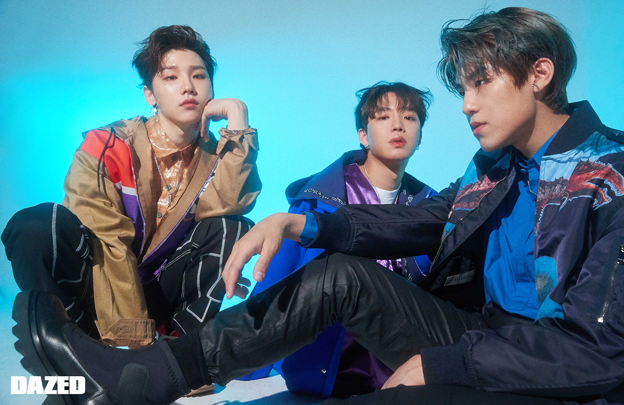 영민이 입은 베이지 재킷과 팬츠, 이너로 입은 화이트 톱, 모자, 새들 메신저백은 모두 디올 맨(Dior Men). 웅이 입은 블루종과 패턴 셔츠는 디올 맨(Dior Men), 블랙 진은 스타일리스트의 것. 대휘가 입은 화이트 로고 재킷과 캡, 메신저 백은 모두 디올 맨(Dior Men) 베이지 컬러 오버사이즈 팬츠는 네스티킥(NSTK).