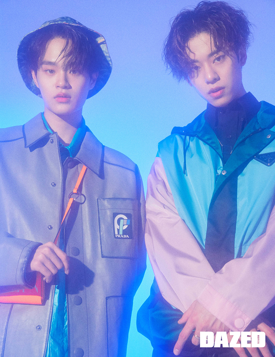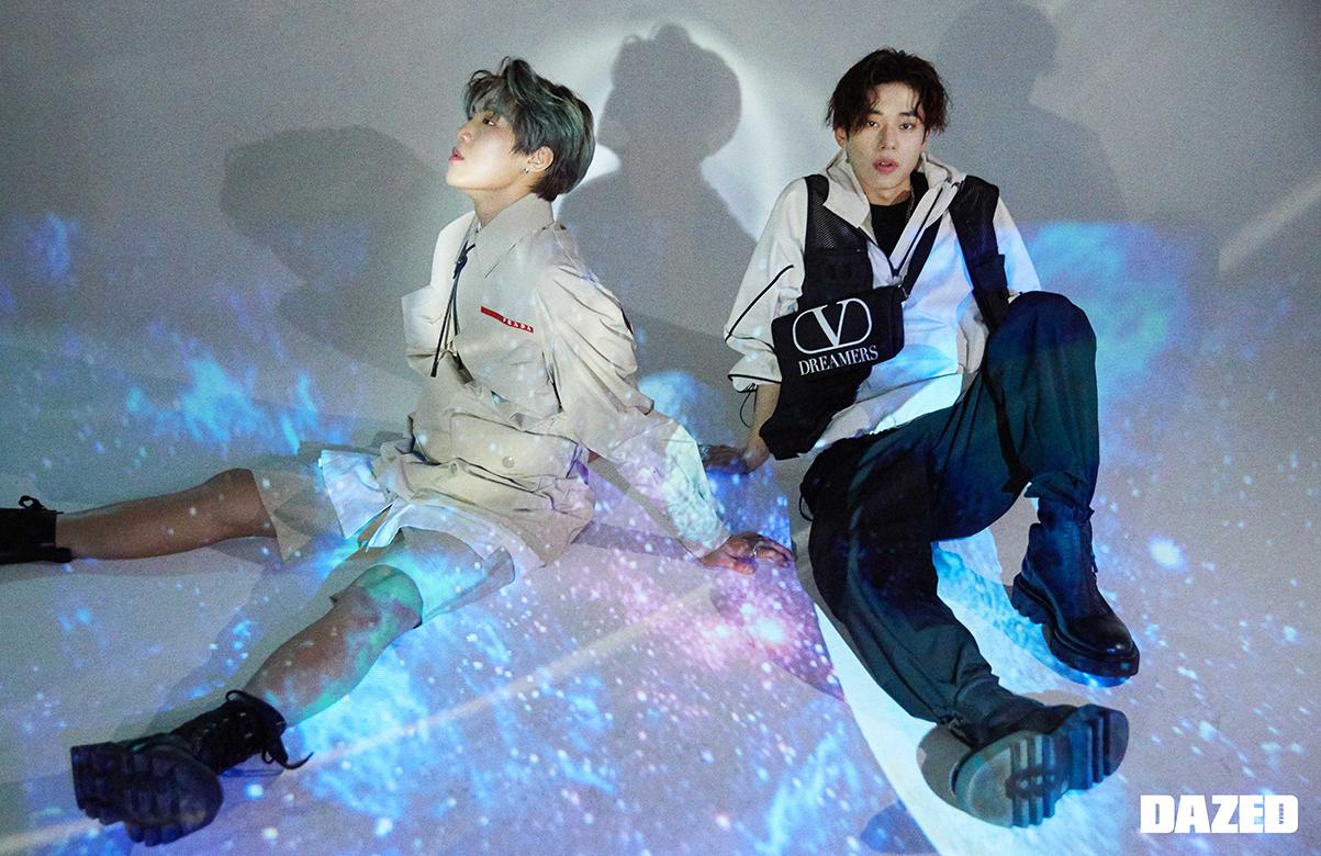 대휘가 입은 그레이 레더 재킷은 프라다 by 육스닷컴(Prada by YOOX.com), 이너로 입은 블루 컬러 윈드브레이커는 인비저블(Invisable), 버킷 해트와 마이크로 백은 발렌티노 가라바니(Valentino Garavani). 동현이 입은 컬러 블록 재킷과 이너로 입은 블랙 셔츠는 프라다(Prada).