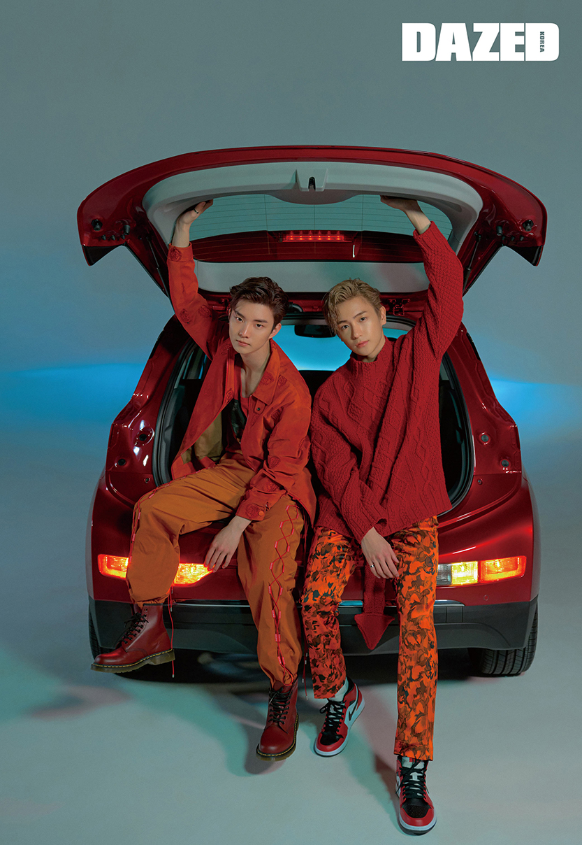 가 입은 도장 모양의 독특한 패턴 재킷은 네이비 by 비욘드클로젯(NAVY by Beyond Closet), 이너로 입은 초상화를 프린트한 슬리브리스는 코치 1941(Coach 1941), 트랙 조거 팬츠는 유저(Youser), 워커는 닥터마틴(Dr. Martens), 링은 큐의 것. 현재가 입은 화살표 모양 꼬리가 달린 니트 톱은 로에베(Loewe), 오렌지 컬러 카무플라주 패턴 팬츠는 드리스 반 노튼 by 분더샵(Dries Van Noten by BOONTHESHOP), 스니커즈는 나이키(Nike), 링은 현재의 것.