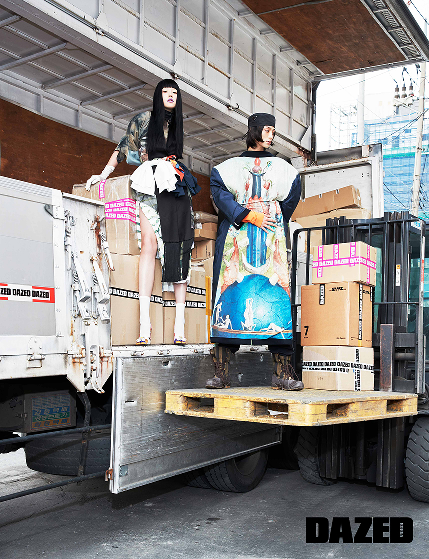 토리가 입은 타이다이 반팔 티셔츠는 프레드 페리(Fred Perry), 안에 입은 메시 소재 프린트 드레스는 장 폴 고티에 펨 by 2000아카이브(Jean Paul Gaultier Femme by 2000archives), 스커트는 3.1 필립 림(3.1 Phillip Lim), 라펠 모양 새틴 스카프는 JW 앤더슨(JW Anderson), 슈즈는 0 몽클레르 리차드 퀸(0 Moncler Richard Quinn), 허리에 묶은 스카프는 비비안 웨스트우드(Vivienne Westwood), 흰색과 검은색 리본 장식 벨트는 한킴(Hankim), 양말은 에디터의 것. 형권이 거꾸로 입은 그래픽 프린트 코트는 진존잼(Jin Jon Jam), 팬츠는 발렌티노(Valentino), 워커는 펜디(Fendi), 모자는 프라다(Prada).