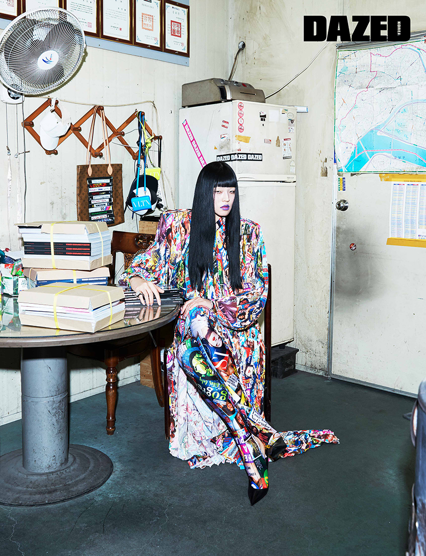 매거진 프린트 다이너스티 플리츠 블라우스와 스커트, 동일한 패턴 레깅스, 큐빅 링, 포인트 토 슈즈는 모두 발렌시아가(Balenciaga), 걸려 있는 캐리 잇 백은 루이 비통(Louis Vuitton), 볼캡 모양 백은 JW 앤더슨(JW Anderson), 네온 컬러 넥 월릿은 발렌티노 가라바니(Valentino Garavani).