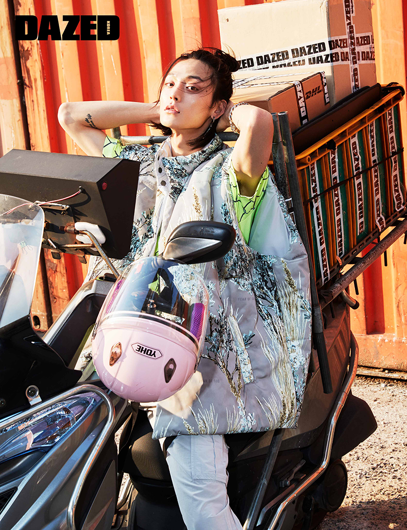 슬리브리스 톱과 이리데슨트 카고 팬츠는 릭 오웬스(Rick Owens), 어깨에 묶은 플라워 포플린 패치워크 후디와 LV 트레이너 스니커 부츠, 트라이앵글 키폴 백은 모두 루이 비통(Louis Vuitton), 가방에 단 에어팟 케이스와 브레이슬릿은 디올(Dior).