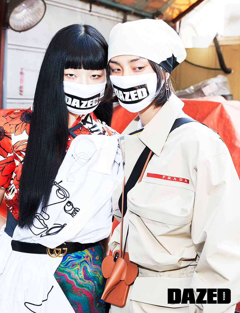 토리가 입은 프린트 셔츠와 벨트는 구찌(Gucci), 얼굴 프린트 슬리브리스 드레스는 모스키노(Moschino), 메탈릭 마블링 스커트는 메종 마르지엘라 by 2000아카이브(Maison Margiela by 2000archives), 레이어드한 펀칭 디테일 드레스는 메종 마르지엘라(Maison Margiela), 슬라이드는 미우 미우(Miu Miu), 마스크와 스타킹은 에디터의 것. 형권이 입은 오버사이즈 포켓 재킷과 안에 입은 셔츠, 쇼츠, 넥 스트랩, 워커, 나일론 백, 모자는 모두 프라다(Prada), 코끼리 모양 폰 케이스는 로에베(Loewe), 마스크는 에디터의 것.