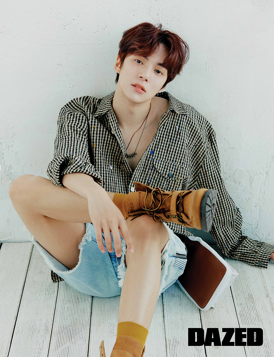 체크 셔츠는 아키비오 제이엠 리봇 by 아데쿠베(Archivio J.m Ribot by Adekuver), 데님 팬츠와 가방은 아미리 by 무이(Amiri by Mue), 부츠는 폴로 랄프 로렌(Polo Ralph Lauren), 네크리스와 양말은 스타일리스트의 것.