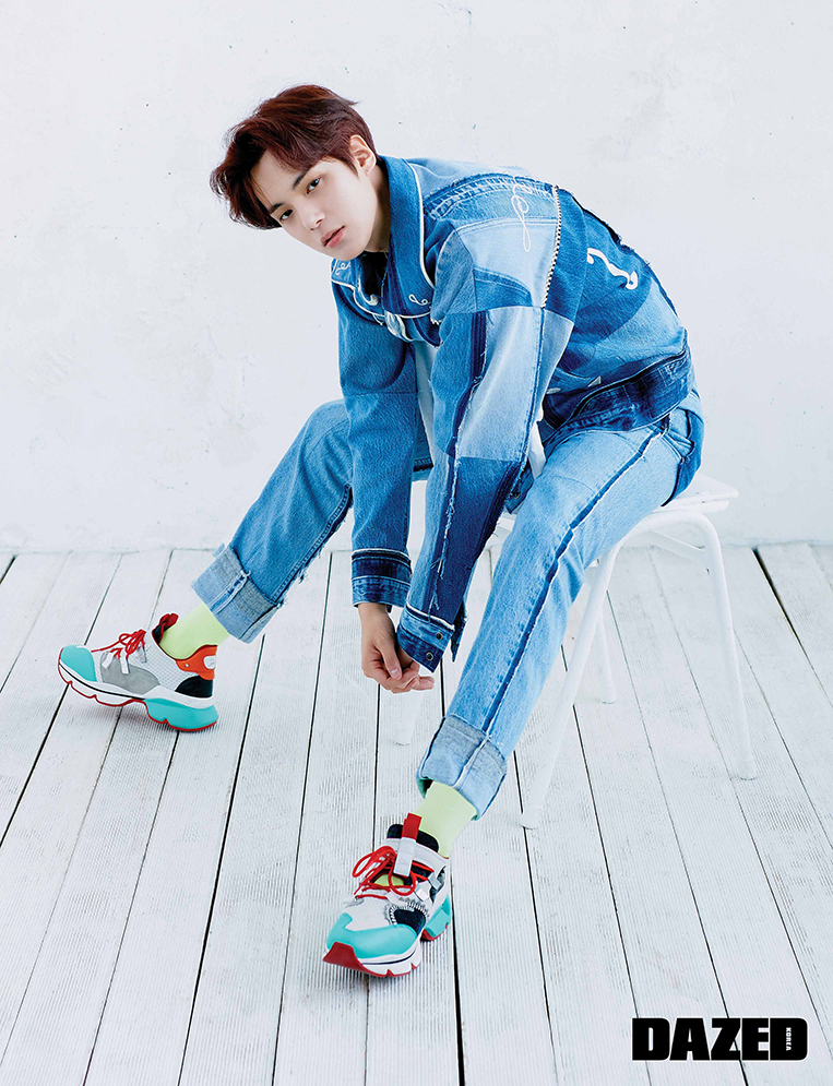 데님 재킷과 팬츠는 디젤 레드 태그×레디메이드 by 분더샵(Diesel Red Tag×Readymade by BOONTHESHOP), 스니커즈는 크리스찬 루부탱(Christian Louboutin), 목걸이는 존 하디(John Hardy), 양말은 스타일리스트의 것.