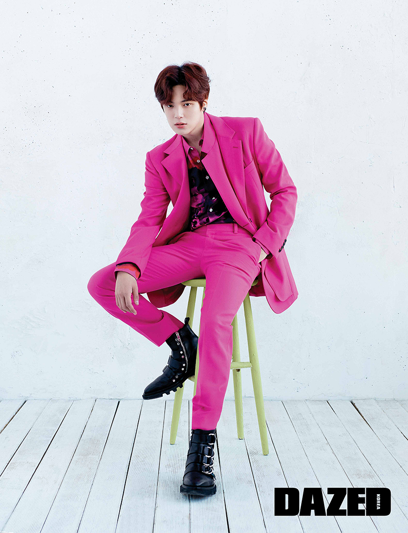 일렉트릭 핑크 컬러의 재킷과 셔츠, 팬츠, 이어링은 모두 알렉산더 맥퀸(Alexander McQueen), 콤배트 부츠는 지방시(Givenchy).