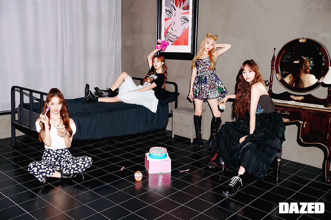 비비가 입은 오프숄더 톱은 스컬프터(Sculptor), 플라워 패턴 팬츠는 오호스(Ojos), 미들부츠는 올루즈(Alluz), 네크리스는 오르시아(Orsia). 최리가 입은 티셔츠는 모스키노(Moschino), 스커트는 푸시 버튼(Push Button), 워커 부츠는 닥터마틴(Dr. Martens), 이어링은 오리지날 오브젝트(Original Object), 네크리스는 스타일리스트의 것. 여진이 입은 드레스는 티백(Tibaeg), 부츠는 스타일리스트의 것. 츄가 입은 드레스는 푸시 버튼(Push Button), 워커 부츠는 닥터마틴(Dr. Martens). 홀 케이크와 머핀은 모두 딩가 케이크(Dinga Cake).