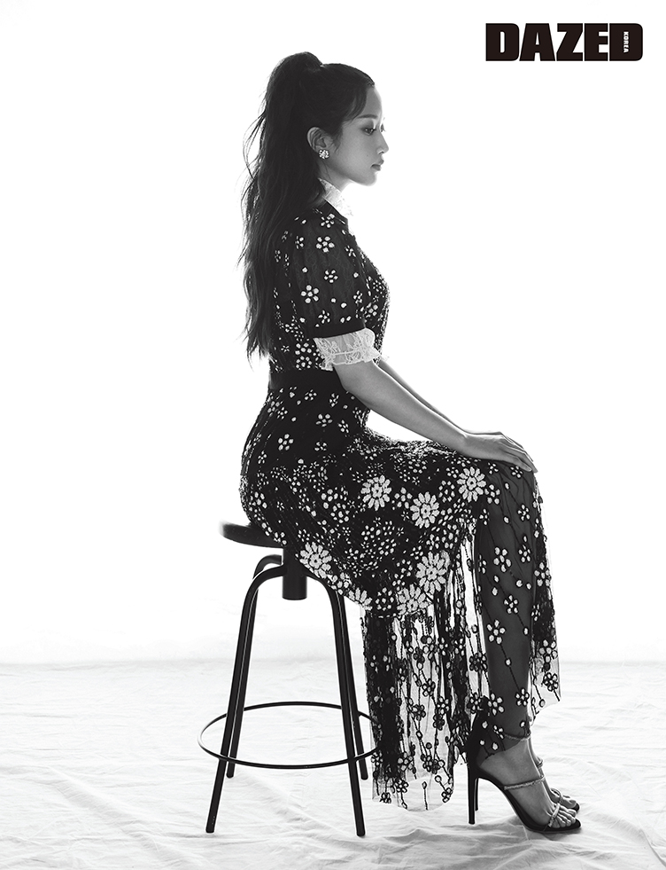 플라워 엠브로이더리 드레스는 셀프 포트레이트 by 한스타일(Self-Portrait by Hanstyle.com), 레이어드한 화이트 톱은 제인송(Jain Song), 스트랩 힐은 주세페 자노티(Giuseppe Zanotti), 이어링은 빈티지헐리우드(Vintage Hollywood).